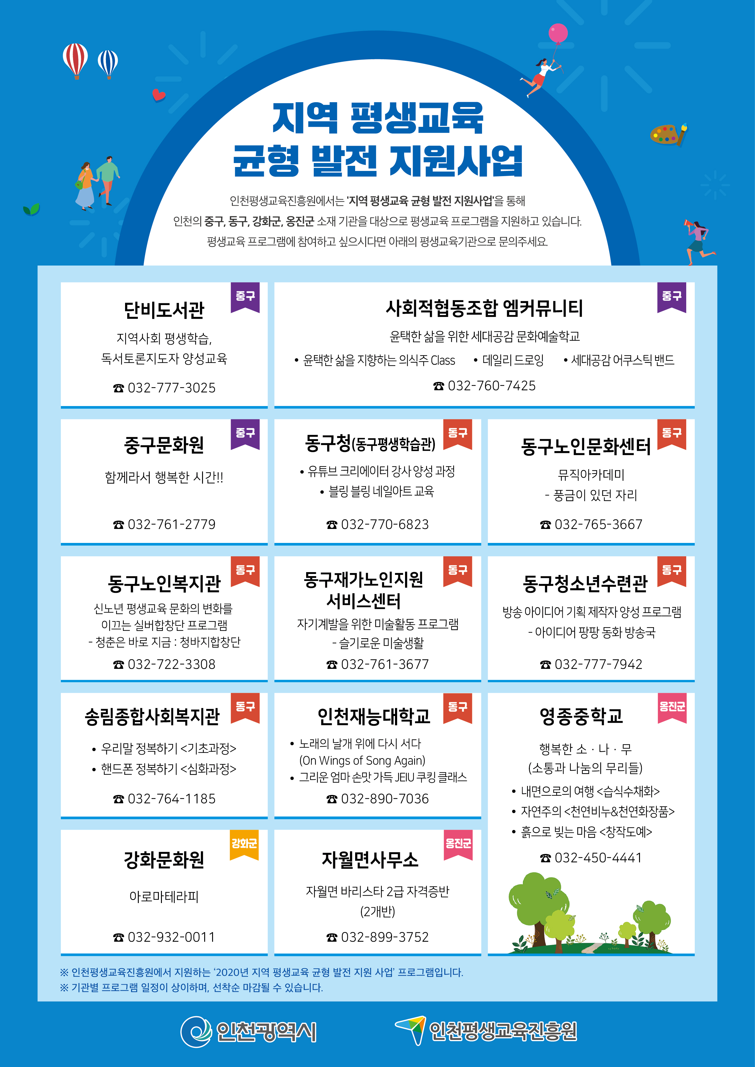 인천평생교육진흥원에서는 인천 지역의 평생교육 균형 발전을 위해 중구, 동구, 강화군, 옹진군의 평생교육을 지원하는 '2020년 지역 평생교육 균형 발전 지원사업'을 추진하고 있습니다.