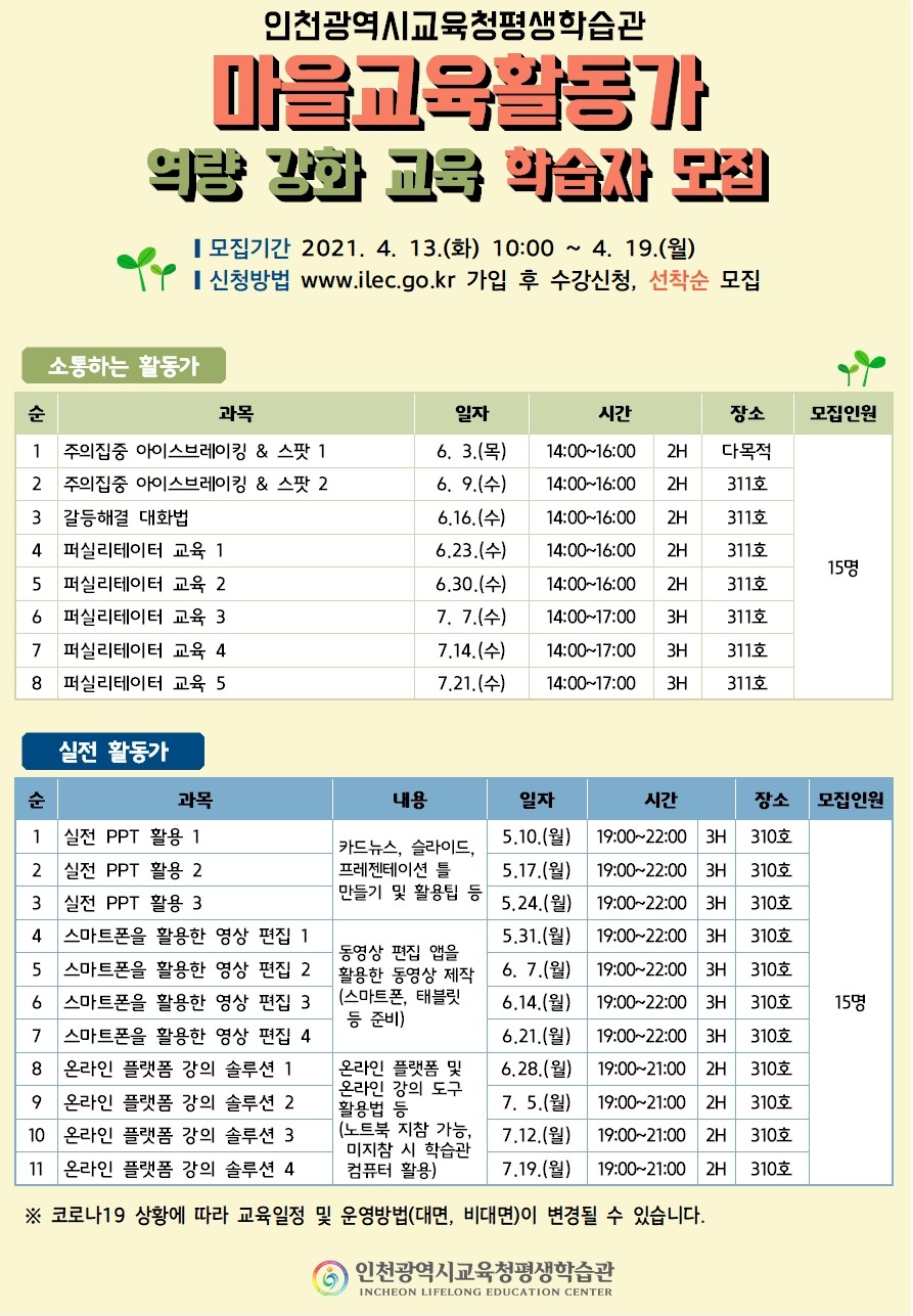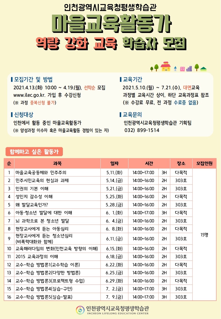 인천광역시교육청평생학습관에서 2021년「마을교육활동가 역량강화 교육」학습자를 붙임과 같이 모집하오니 교육에 관심있으신 주민들은 게시글에 첨부된 홍보물을 확인하여 주시기 바랍니다.