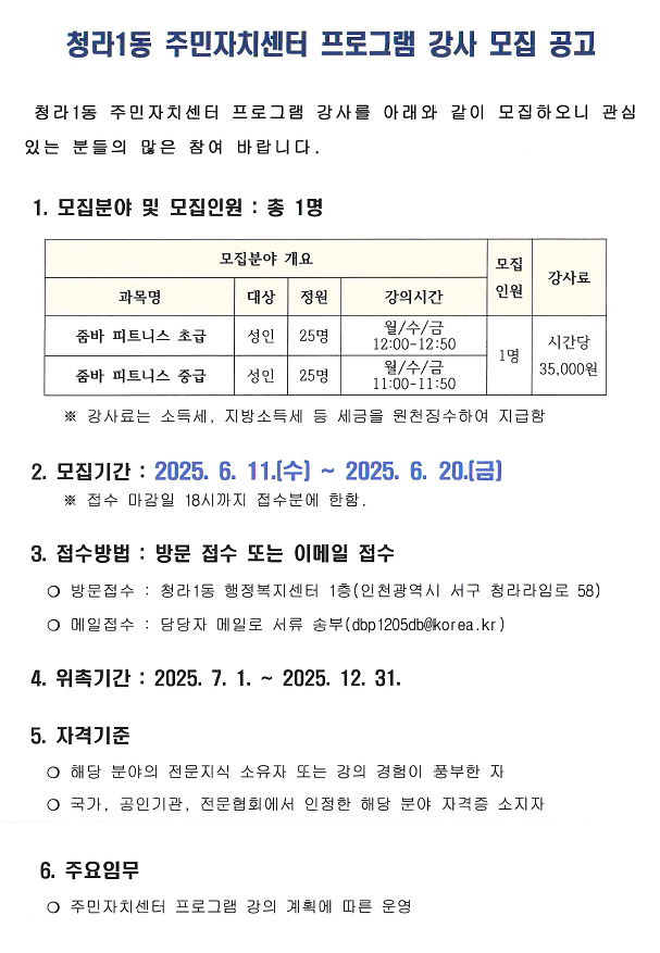 [강사모집] 청라1동 주민자치센터 줌바프로그램 강사모집 안내