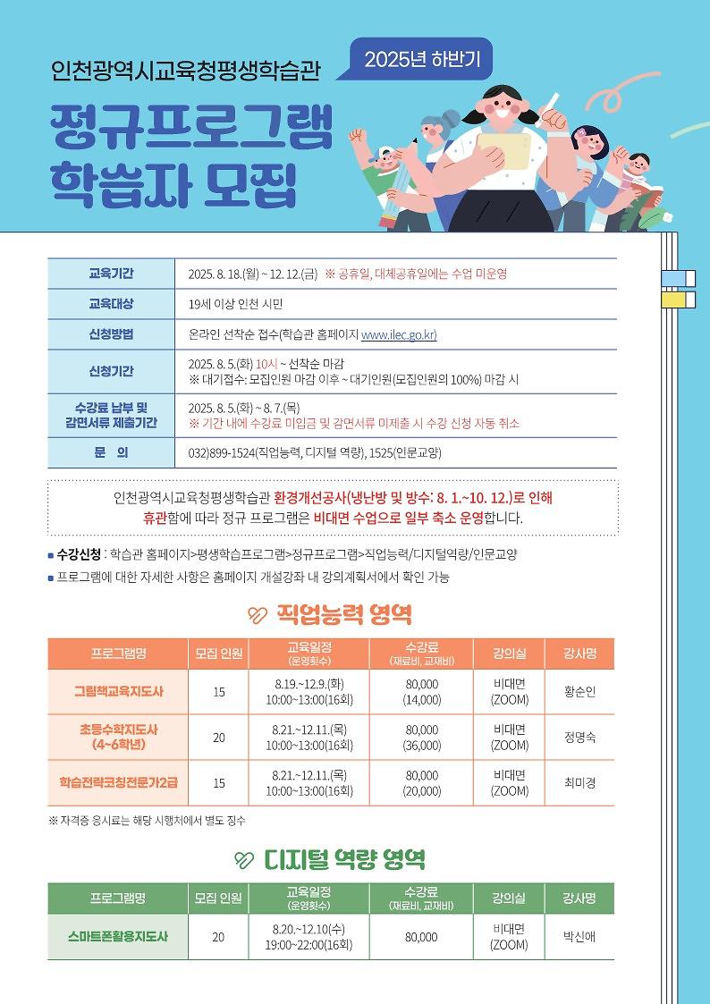 ○ 신청방법: 인천광역시교육청평생학습관 홈페이지 선착순 접수
