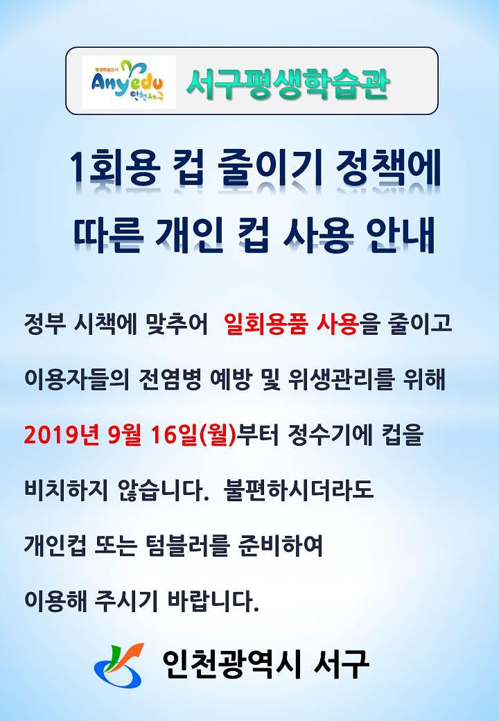 ★정부 시책에 맞추어 서구평생학습관에서도 일회용품 사용을 줄이고 개인 컵 사용을 권장하고 있습니다. ★조금 불편하지만 환경을 살리는 이용자들의 노력에 감사드립니다.