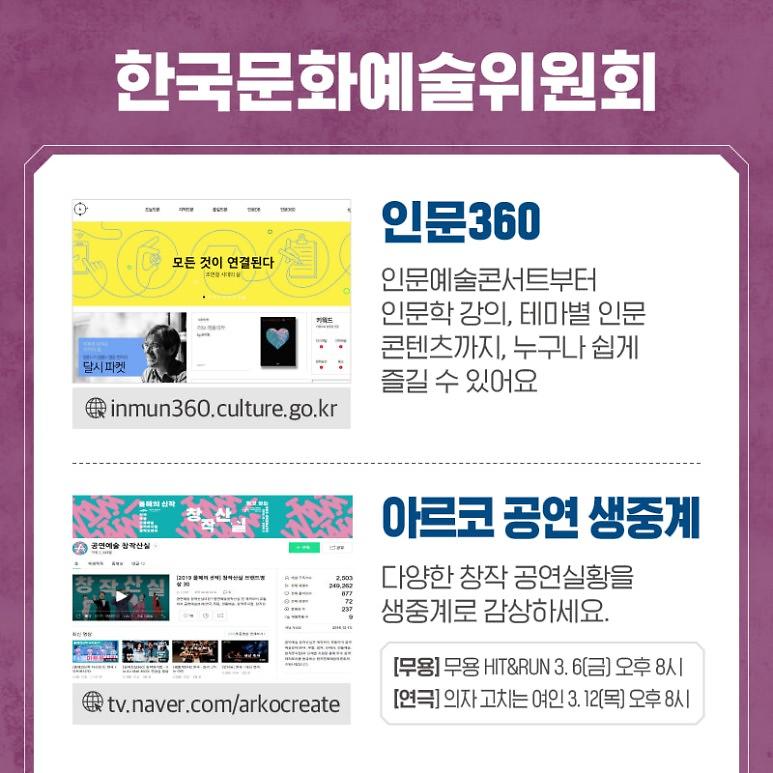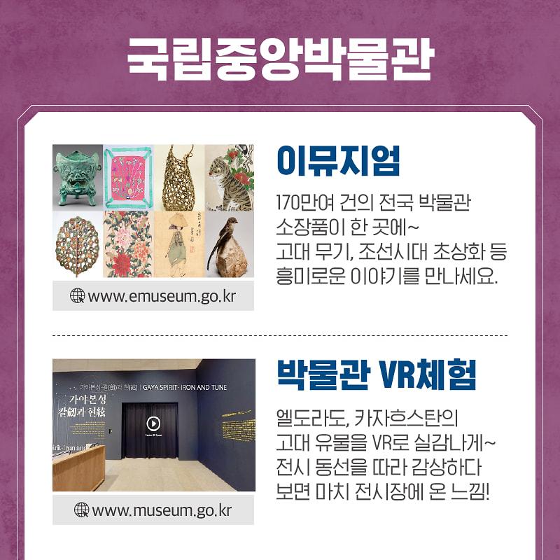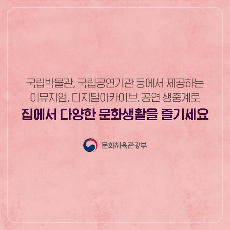 국립박물관, 국립공연기관 등에서 제공하는 이뮤지엄, 디지털아카이브, 공연 생중계로 집에서 다양한 문화생활을 즐기세요.