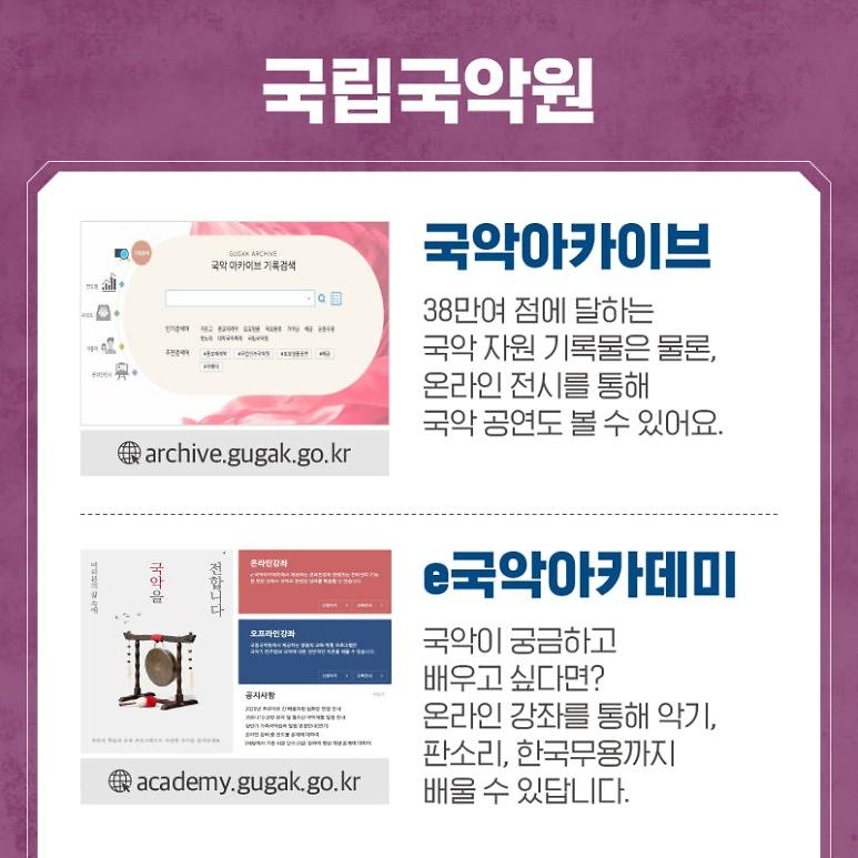 38만여 점에 달하는 국악 자원 기록물은 물론, 온라인 전시를 통해 국악 공연도 볼 수 있어요.