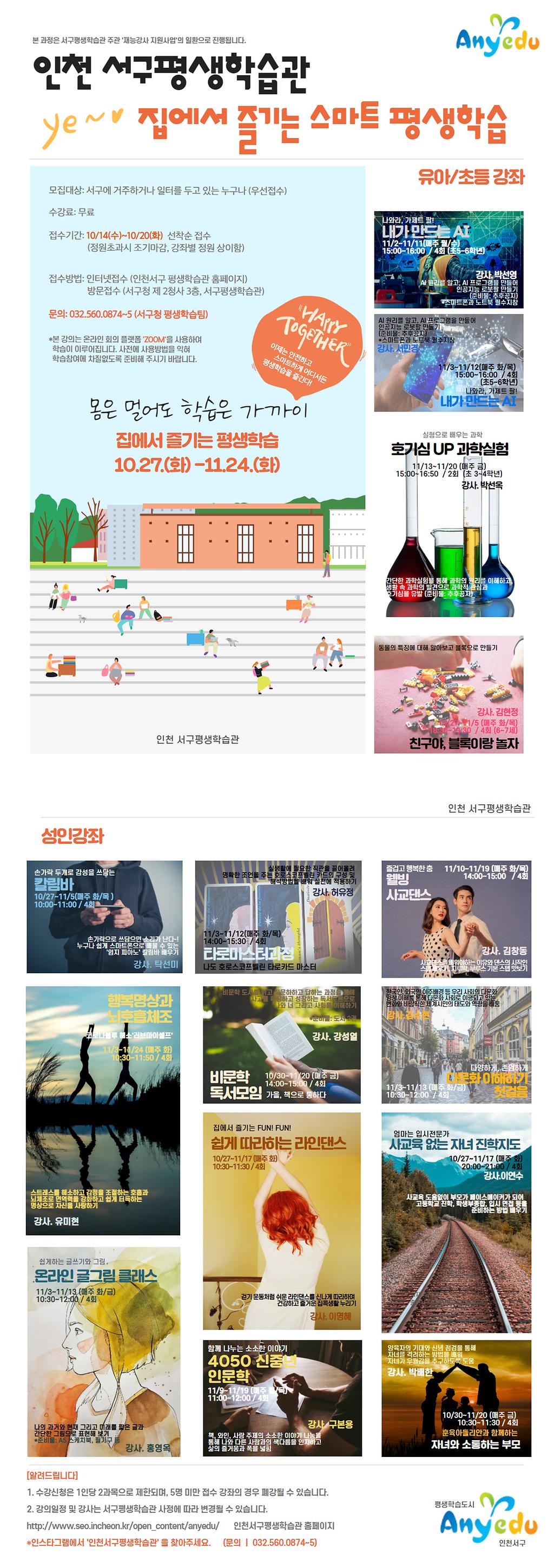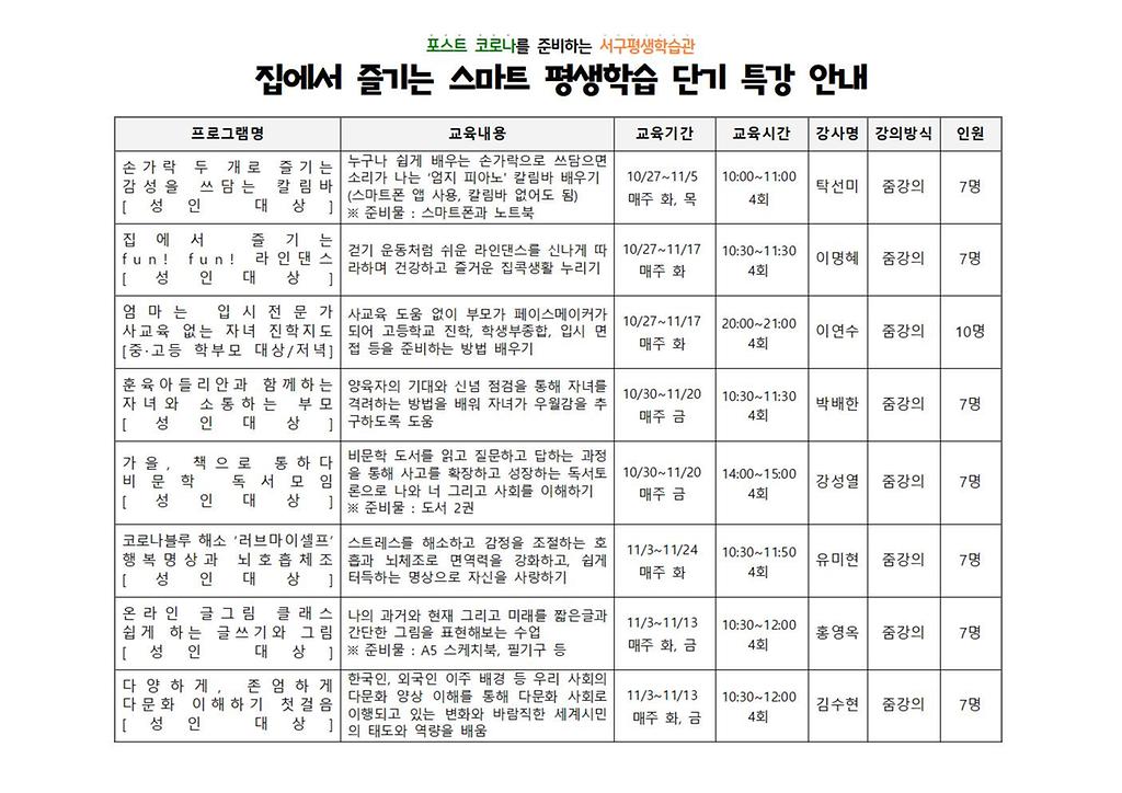 ○ 교육기간 : 2020. 10. 27.(화) ~ 11. 20.(화) (강좌별 상이)