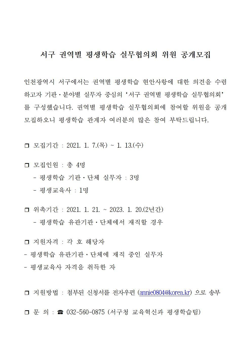 문 의 : 032-560-0875 (서구청 교육혁신과 평생학습팀)