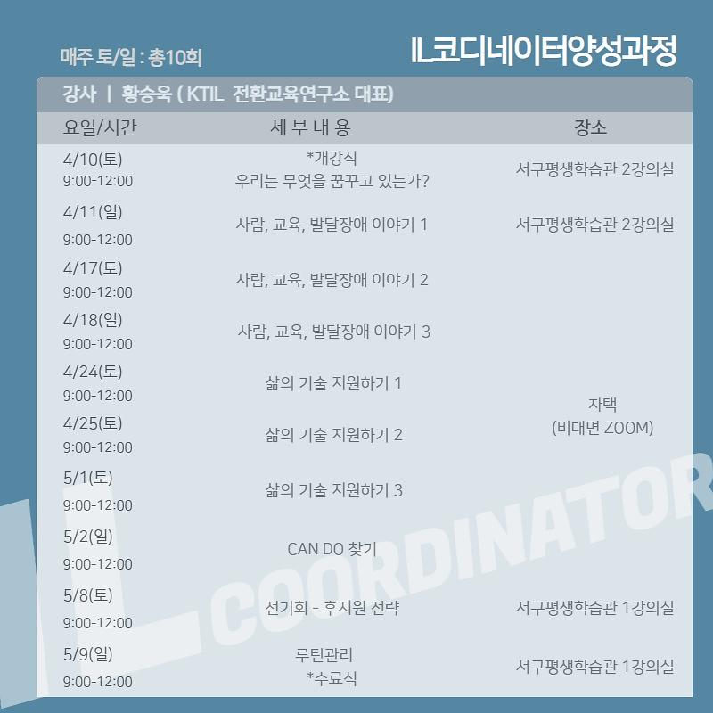 ○ 교육기간 : 2021. 4. 10.(토) ~ 5. 9.(일) 9:00~12:00 (매주 토/일) 총 10주