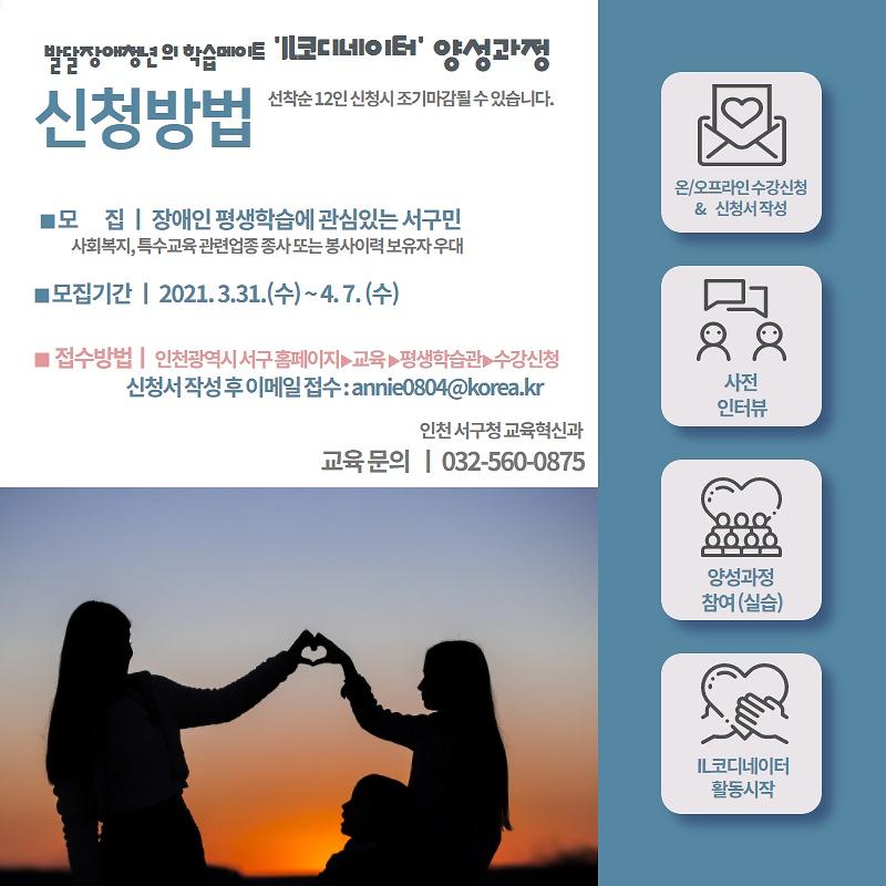 - 6월, (재) 인천인재평생교육진흥원에서 주관하는 '2021 찾아가는 장애인 맞춤형 평생교육' 학습지원인력으로 투입됩니다.