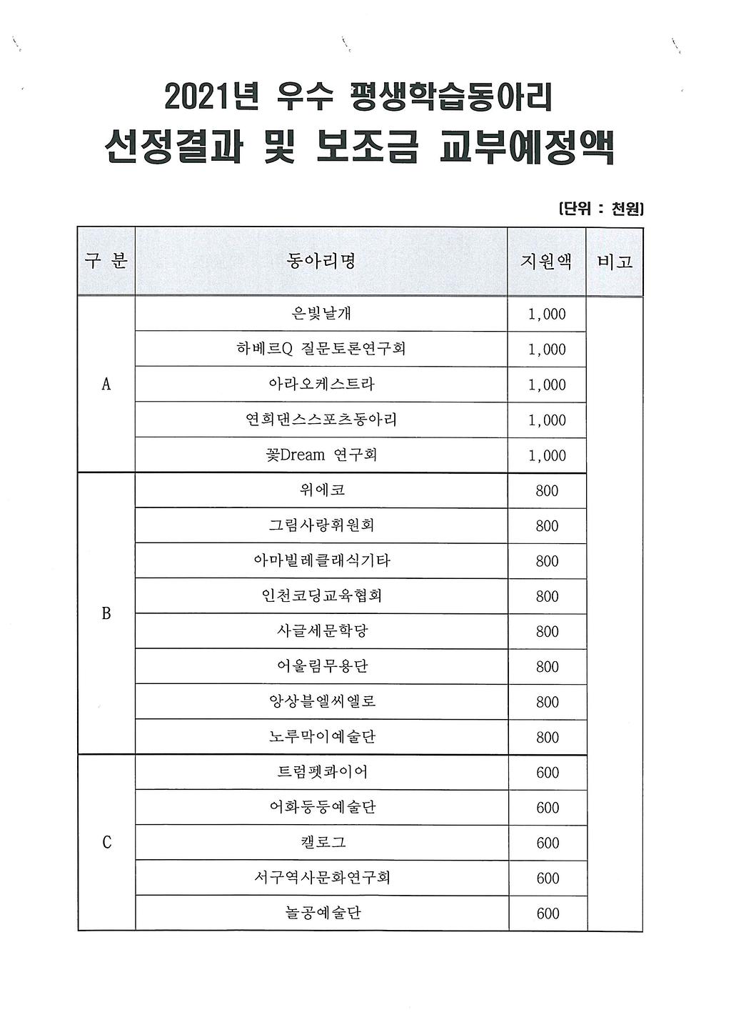 2021년 우수 평생학습동아리 활성화 지원사업에 신청해주신 모든 동아리분들께 감사드리며, 선정 결과를 아래과 같이 공고합니다.
