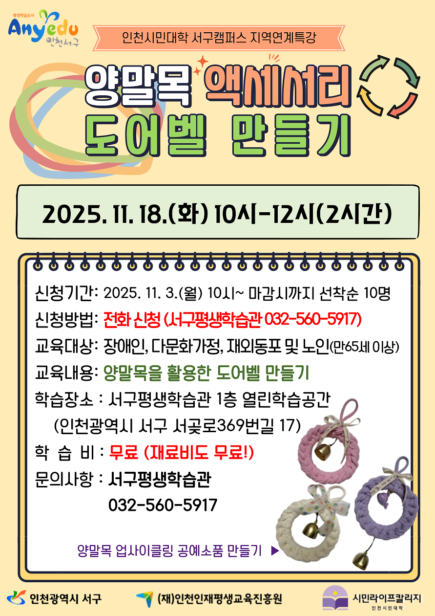 서구평생학습관 성과공유회와 연계하여 지역 연계 특강 <양말목 액세서리 : 도어벨 만들기>을 진행합니다.