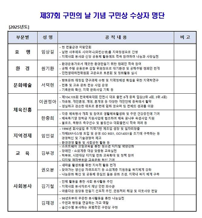 제37회 구민상 수상자 명단(2025년도)
