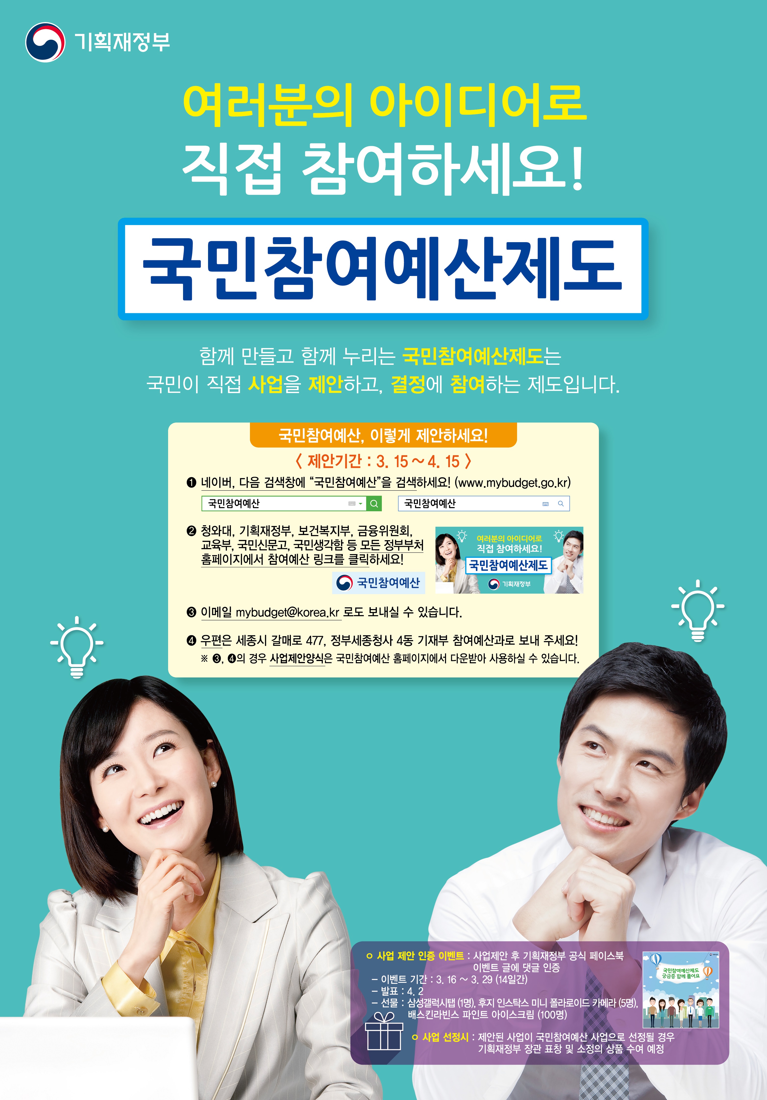 4. 우편은 세종시 갈매로 477, 정부세종청사 4동 기재부 참여 예산과로 보내 주세요!