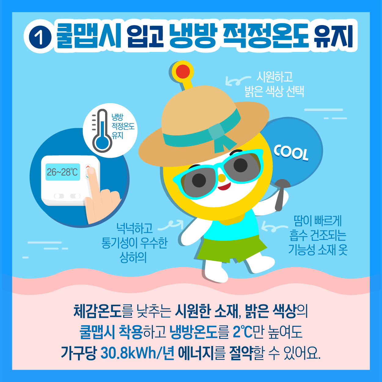 체감온도를 낮추는 시원한 소재, 밝은 색상의 쿨맵시 착용하고 냉방온도를 2℃만 높여도 가구당 30.8kWh/년 에너지를 절약할 수 있어요