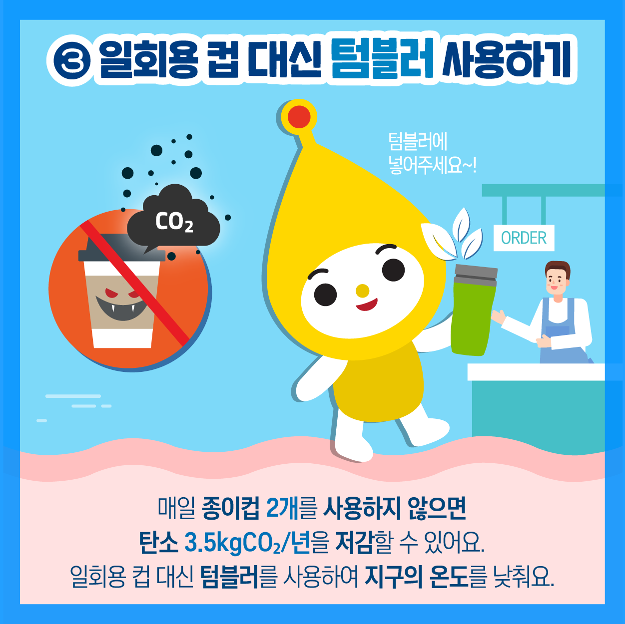 매일 종이컵 2개를 사용하지 않으면 탄소 3.5kgCO2/년을 저감할 수 있어요. 일회용 컴 대신 텀블러를 사용하여 지구의 온도를 낮춰요