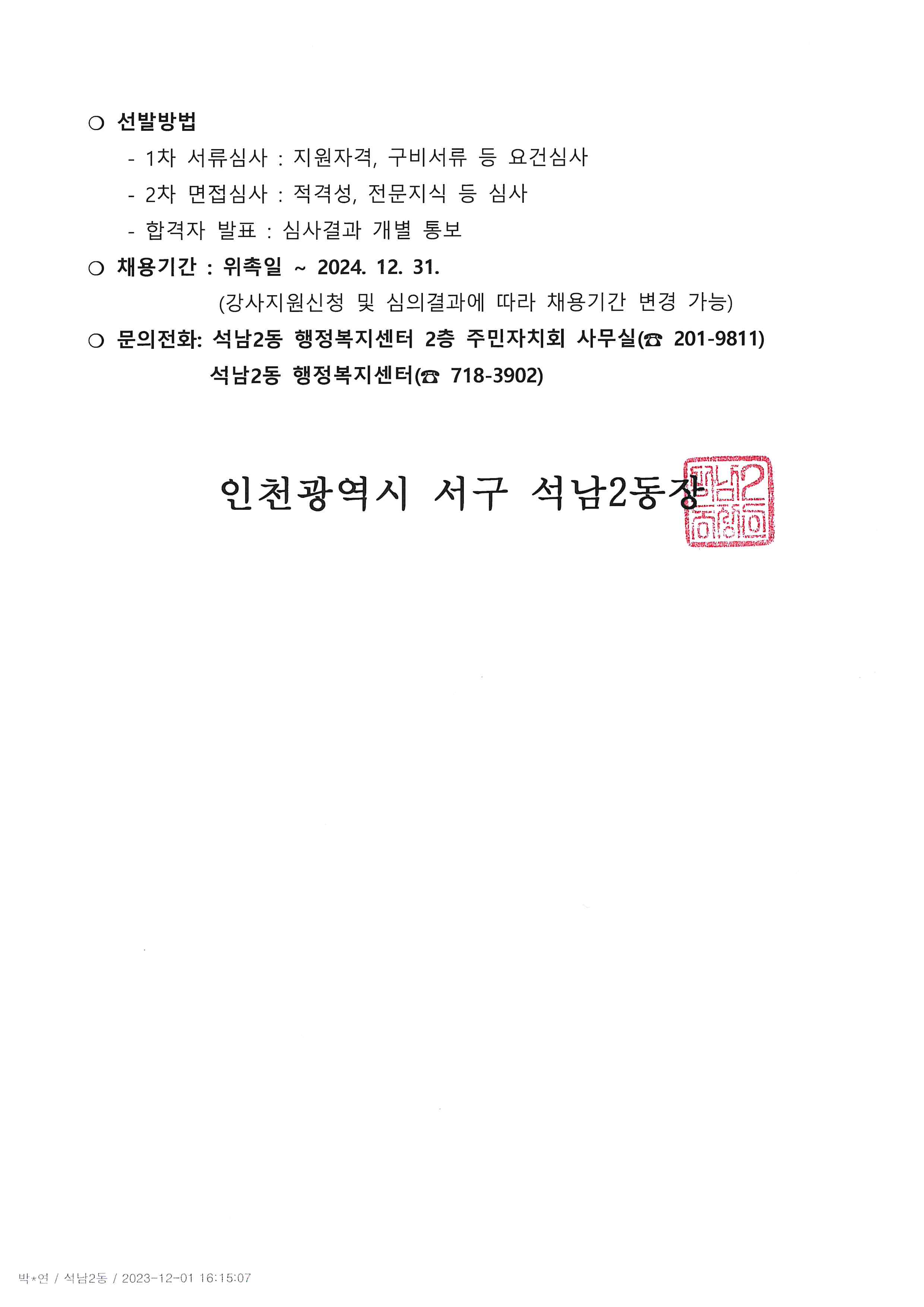 석남2동 주민자치센터 취미교양교실 강사 추가모집 공고