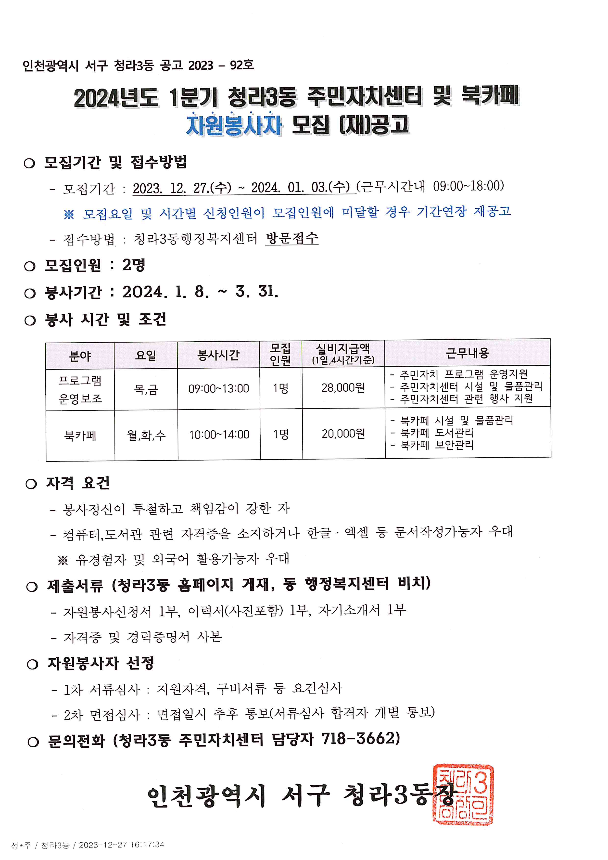 2024년도 1분기 ㅣ청라3동 주민자치센터 및 북카페 자원봉사자 모집 (재)공고