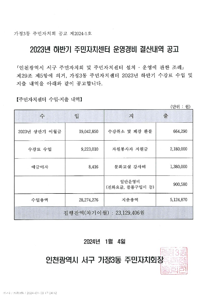 2023년 하반기 주민자치센터 운영경비 결산내역 공고