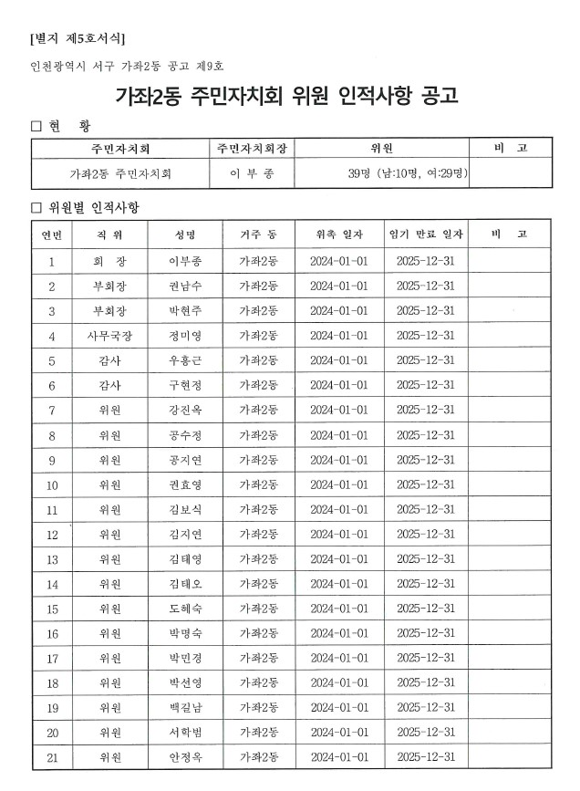 가좌2동 주민자치회 위원 인적사항 공고