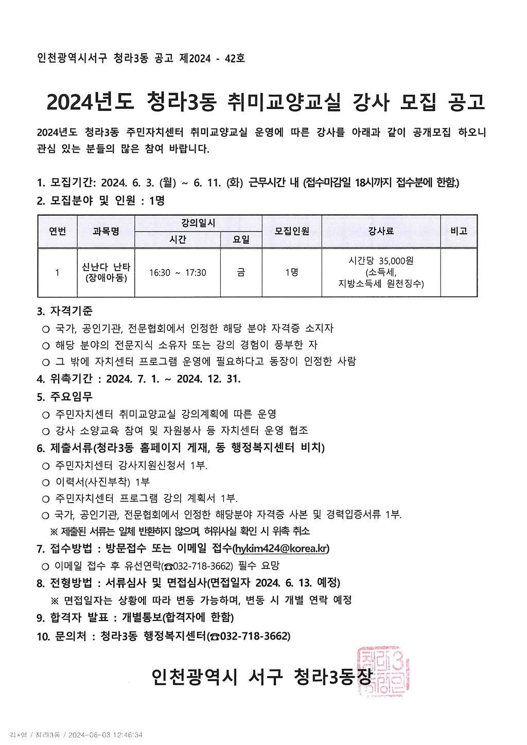 2024년도 청라3동 주민자치센터 취미교양교실[신난다난타(장애아동)] 강사 모집 공고