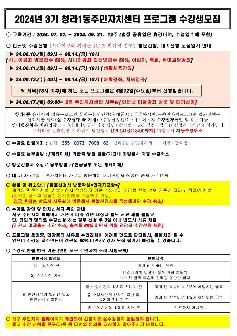 2024년 3분기 청라1동 주민자치센터 프로그램 수강생 모집 안내
