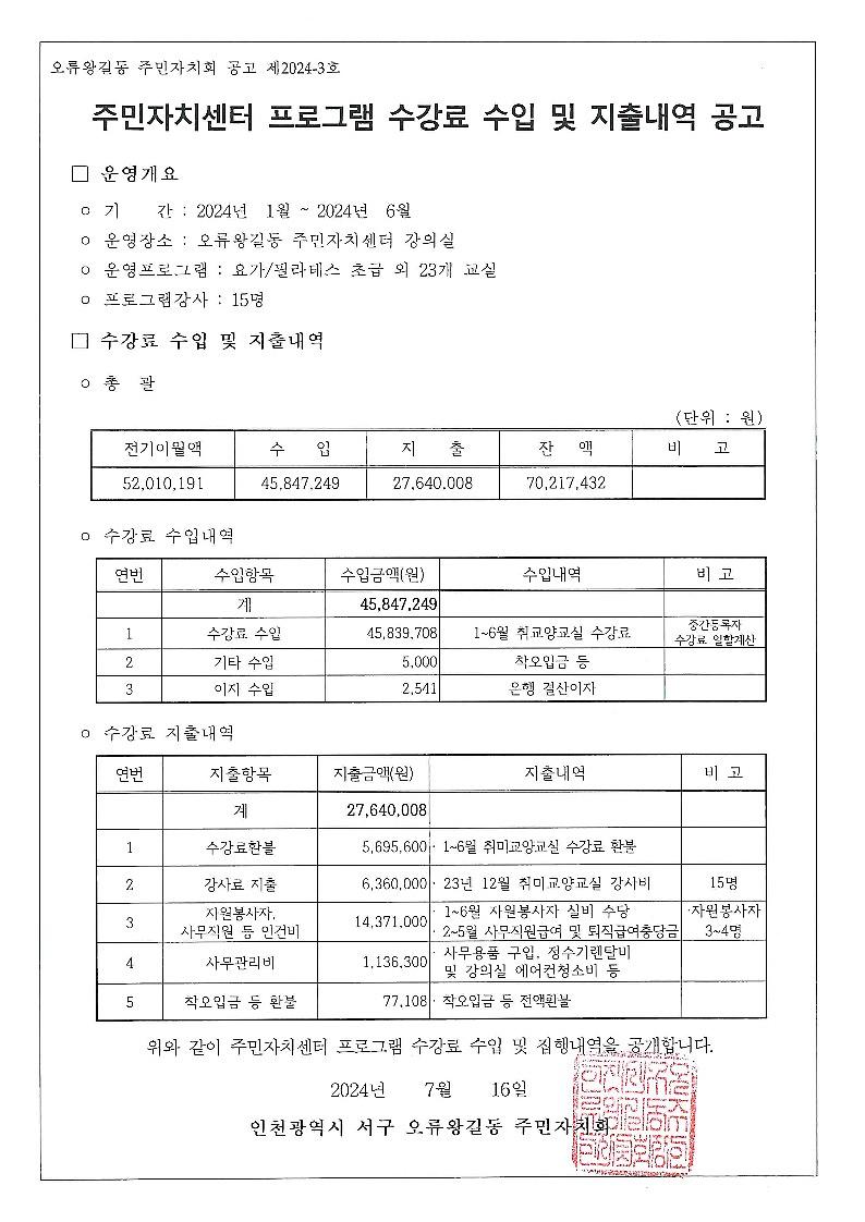 2024년 상반기 오류왕길동 주민자치센터 프로그램 수강료 수입 및 지출 결산내역을 붙임과 같이 공고합니다.