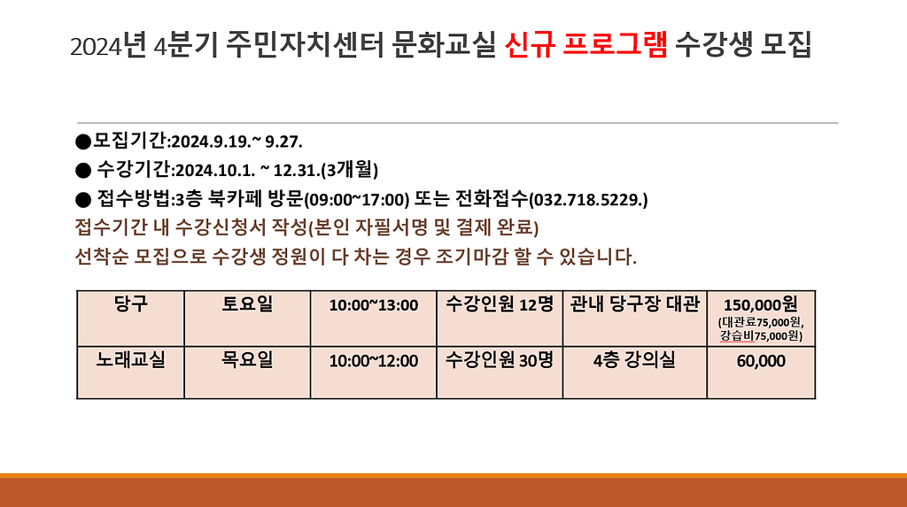 2024년 4분기 주민자치센터 문화교실 신규 프로그램 수강생 모집