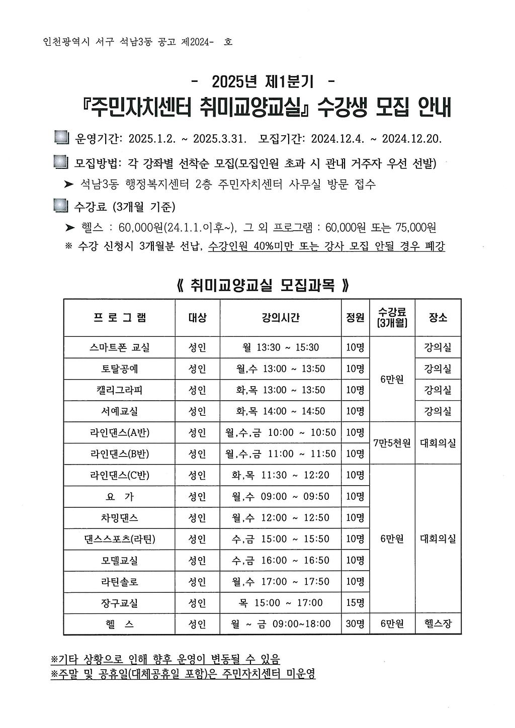 수강일과 자생단체 등 회의일정이 겹칠 경우 해당일에는 강의 진행이 어려울 수 있는 점 양해부탁드립니다.