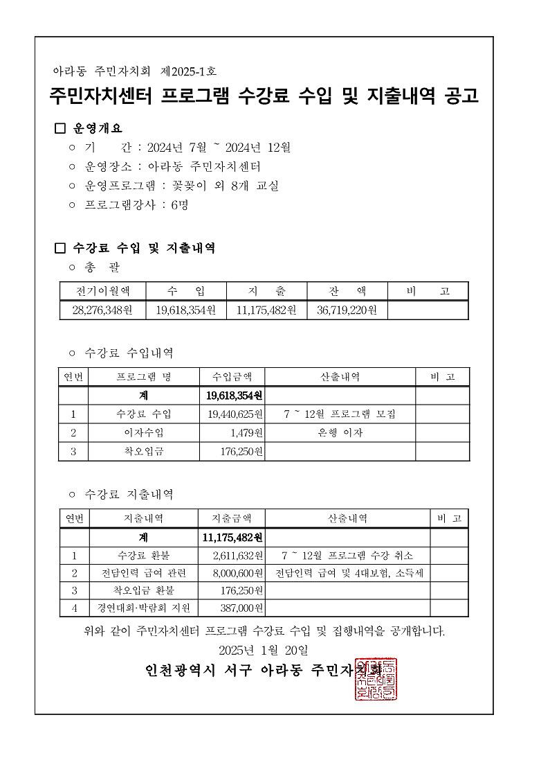 2024년 하반기 아라동 주민자치센터 프로그램 수강료 수입 및 지출 결산 내역을 붙임과 같이 공고합니다.