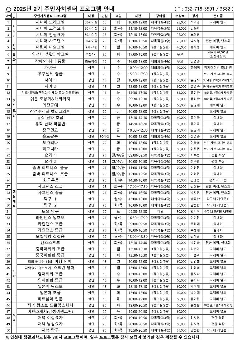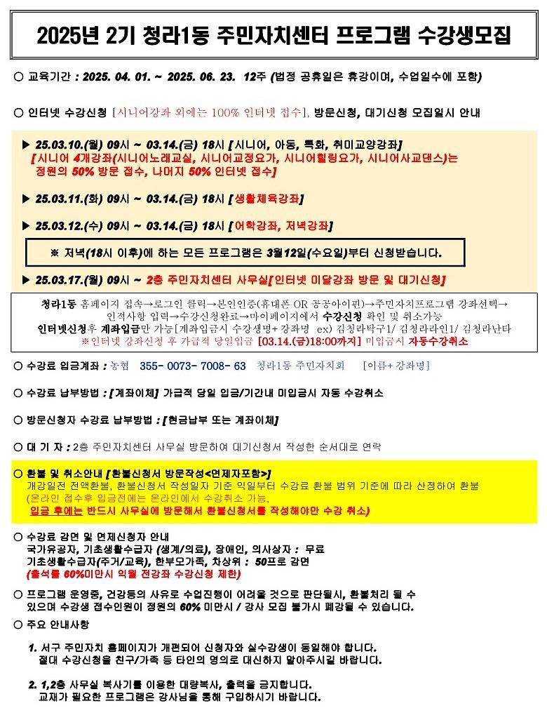 2025년 2분기 청라1동 주민자치센터 프로그램 수강생 모집 안내