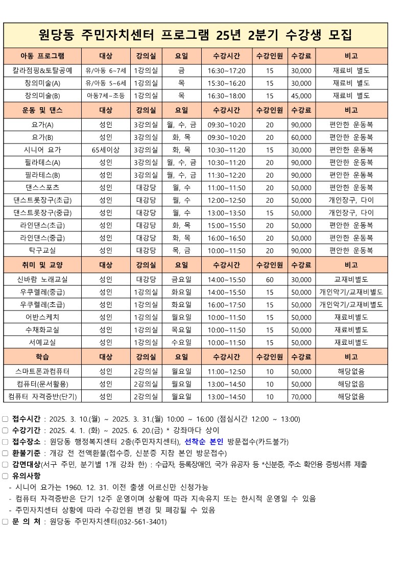 원당동 주민자치센터 문화프로그램 2025년 2분기 수강생 모집 안내