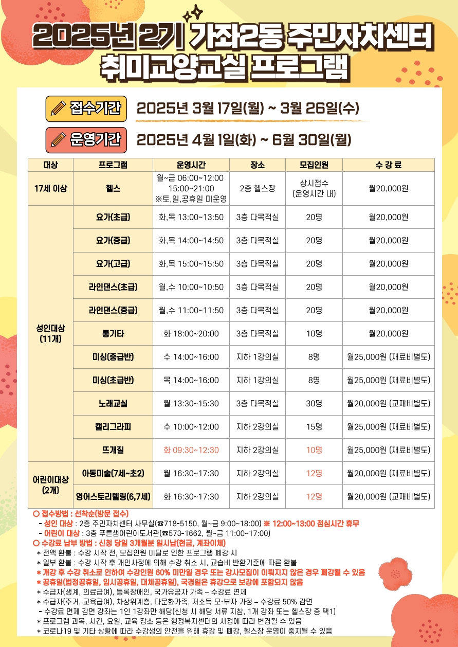 2025년 2분기 가좌2동 주민자치센터 취미교양교실 수강생을 모집하오니,