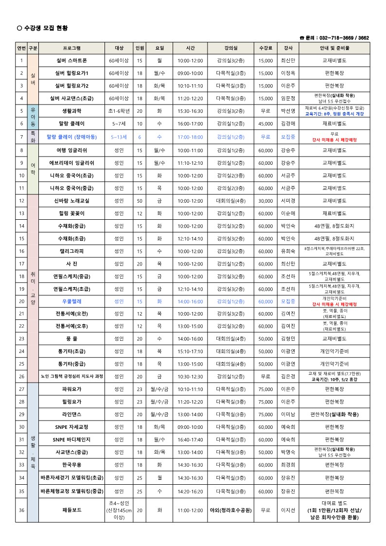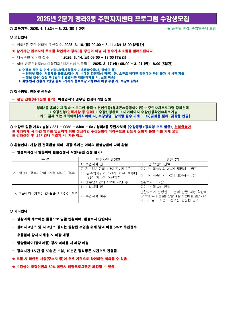 2025년 2분기 청라3동 주민자치센터 프로그램 수강생 모집 안내