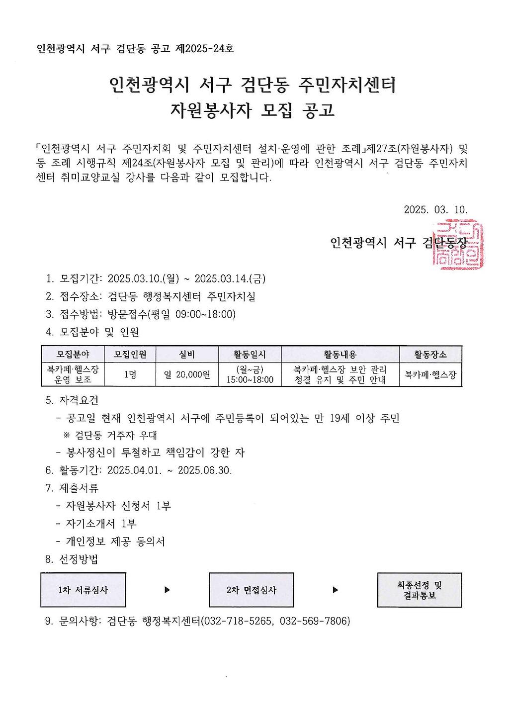 인천광역시 서구 검단동 주민자치센터 자원봉사자 모집 공고
