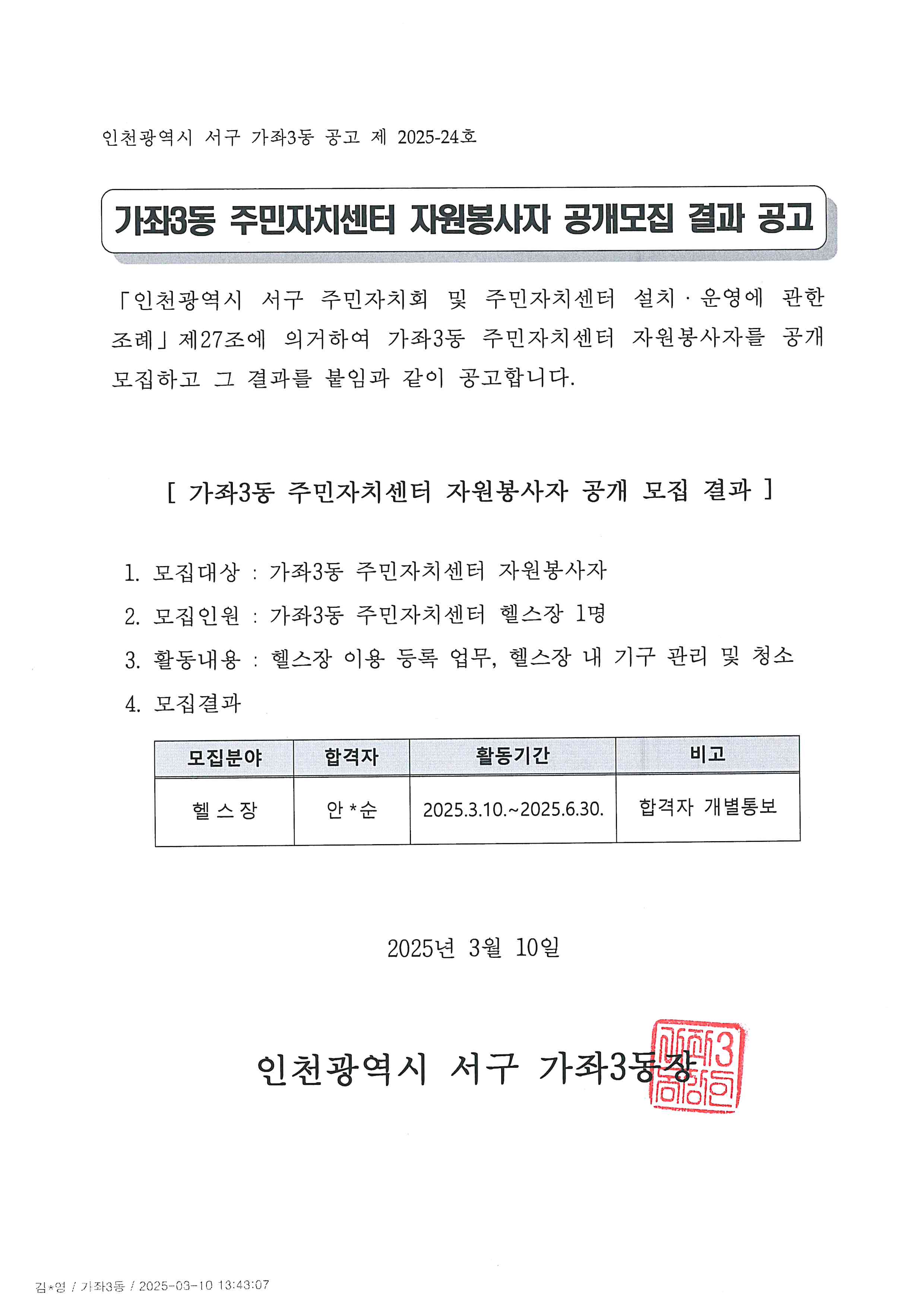 「인천광역시 서구 주민자치회 및 주민자치센터 설치·운영에 관한 조례」제27조에 의거하여 2025년 가좌3동 주민자치센터 자원봉사자(헬스장 운영요원)를 공개모집하고 그 결과를 붙임과 같이 공고합니다.
