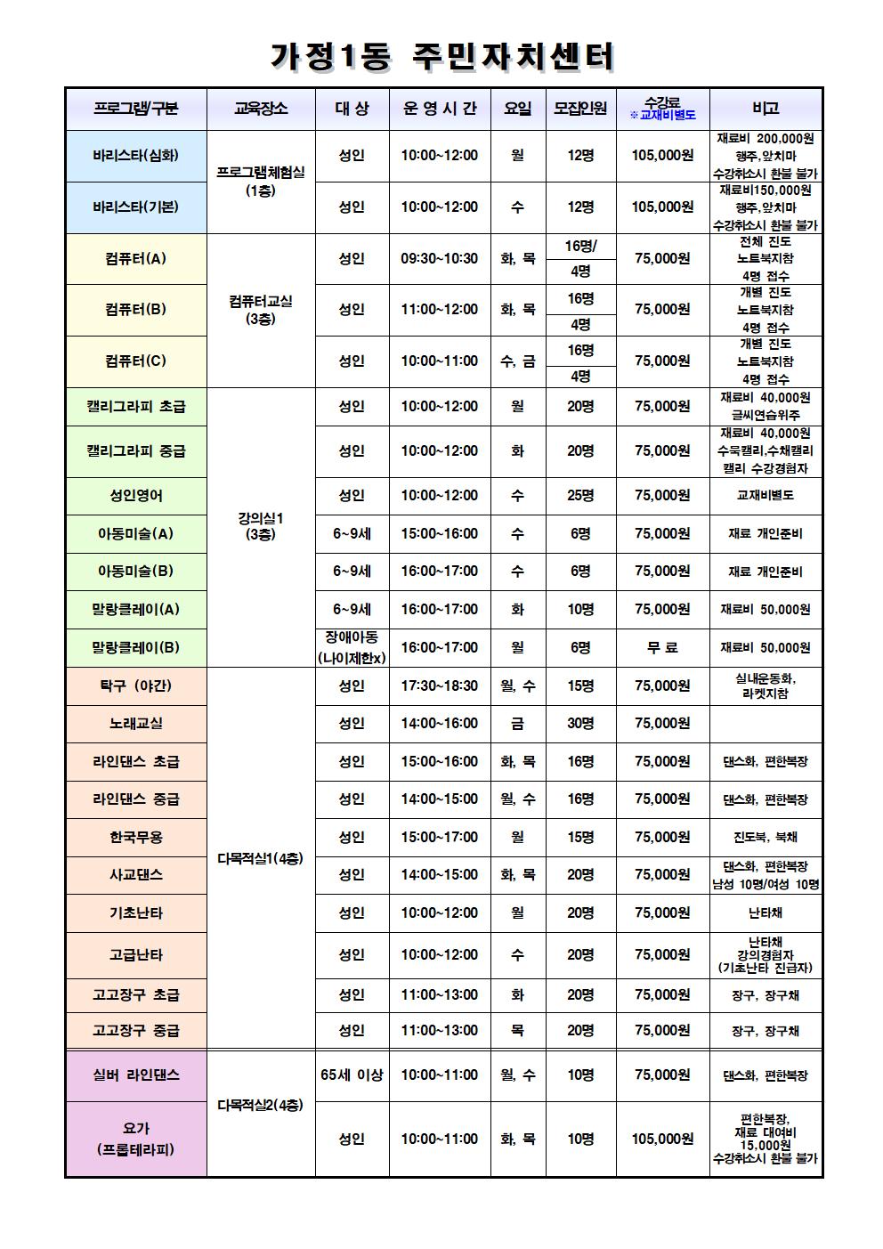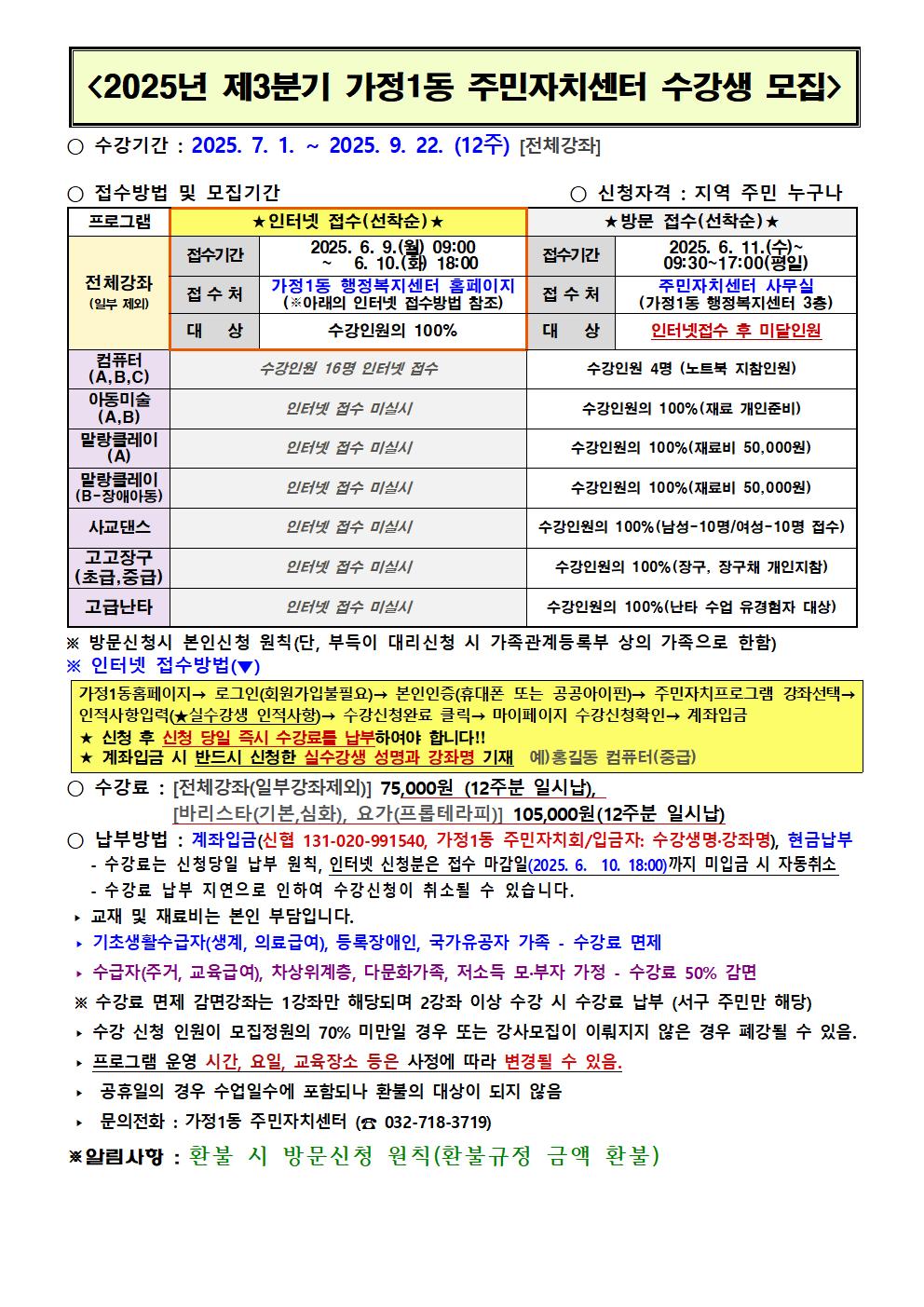 2025년 3분기 가정1동 주민자치센터 수강생 모집 안내문