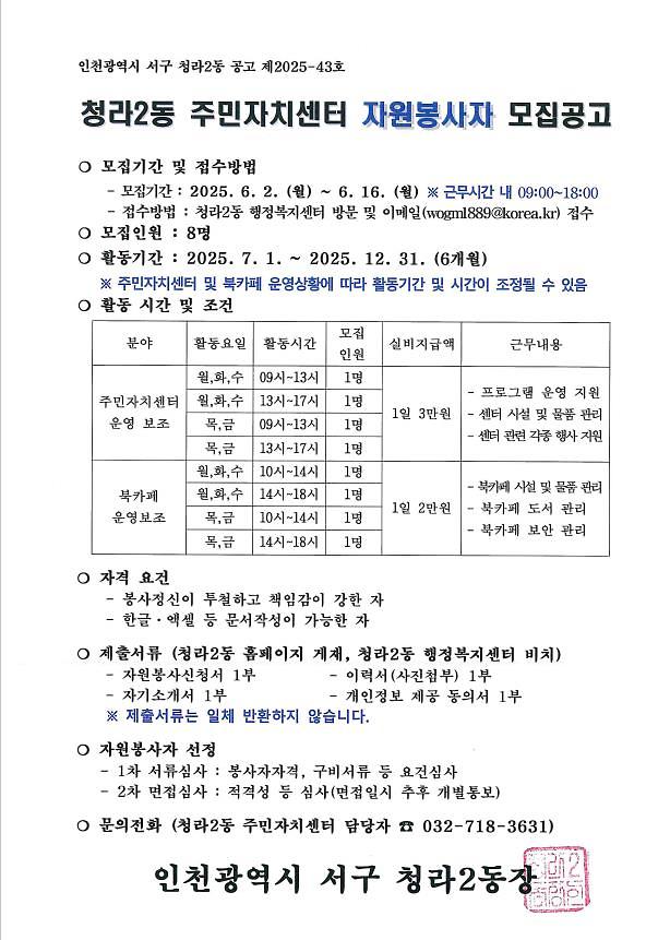 2025년도 하반기 청라2동 주민자치센터 및 북카페에서 활동하실 자원봉사자를 모집하오니