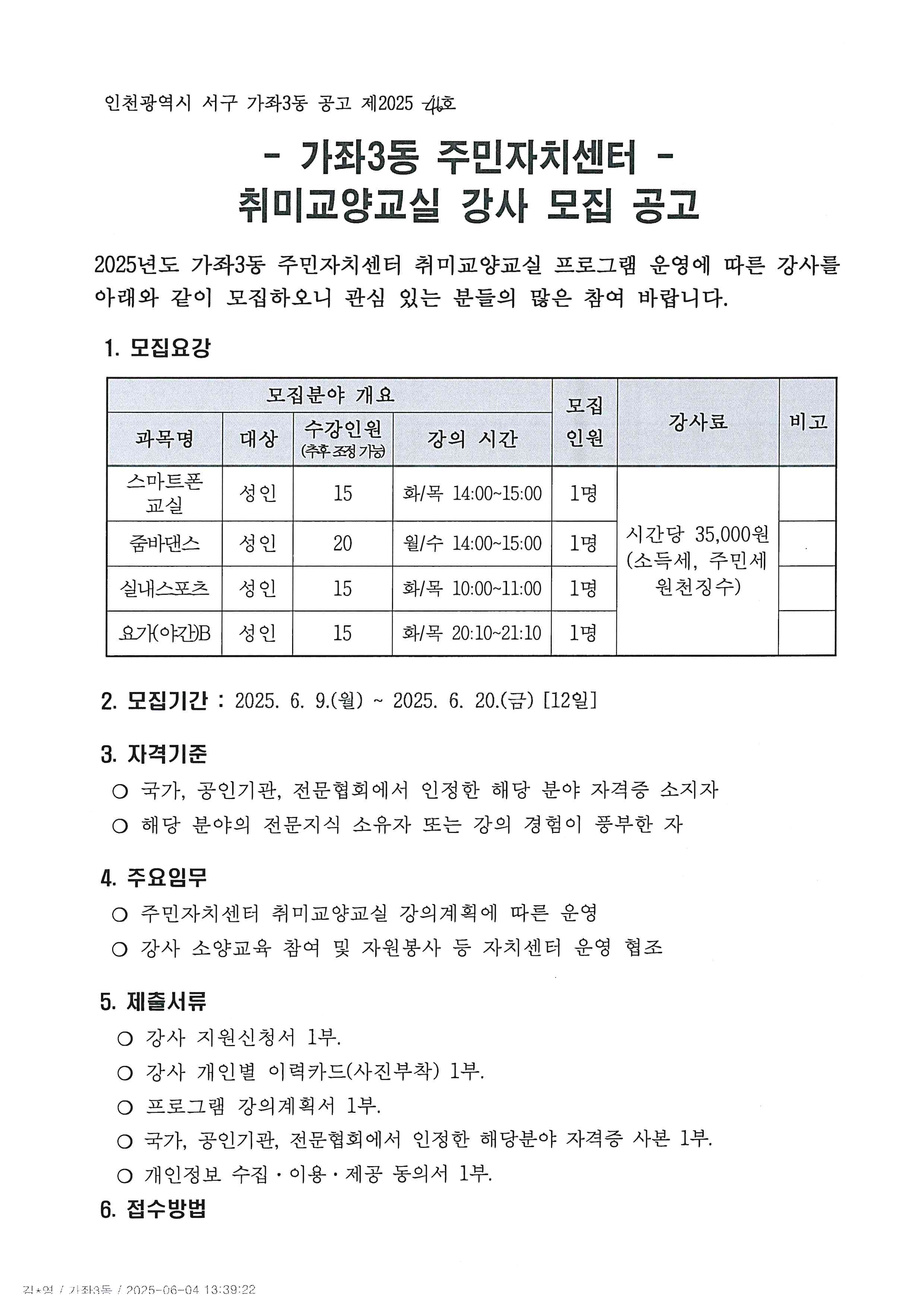 가. 공고명: 2025년 가좌3동 주민자치센터 취미교양교실 강사 모집 공고