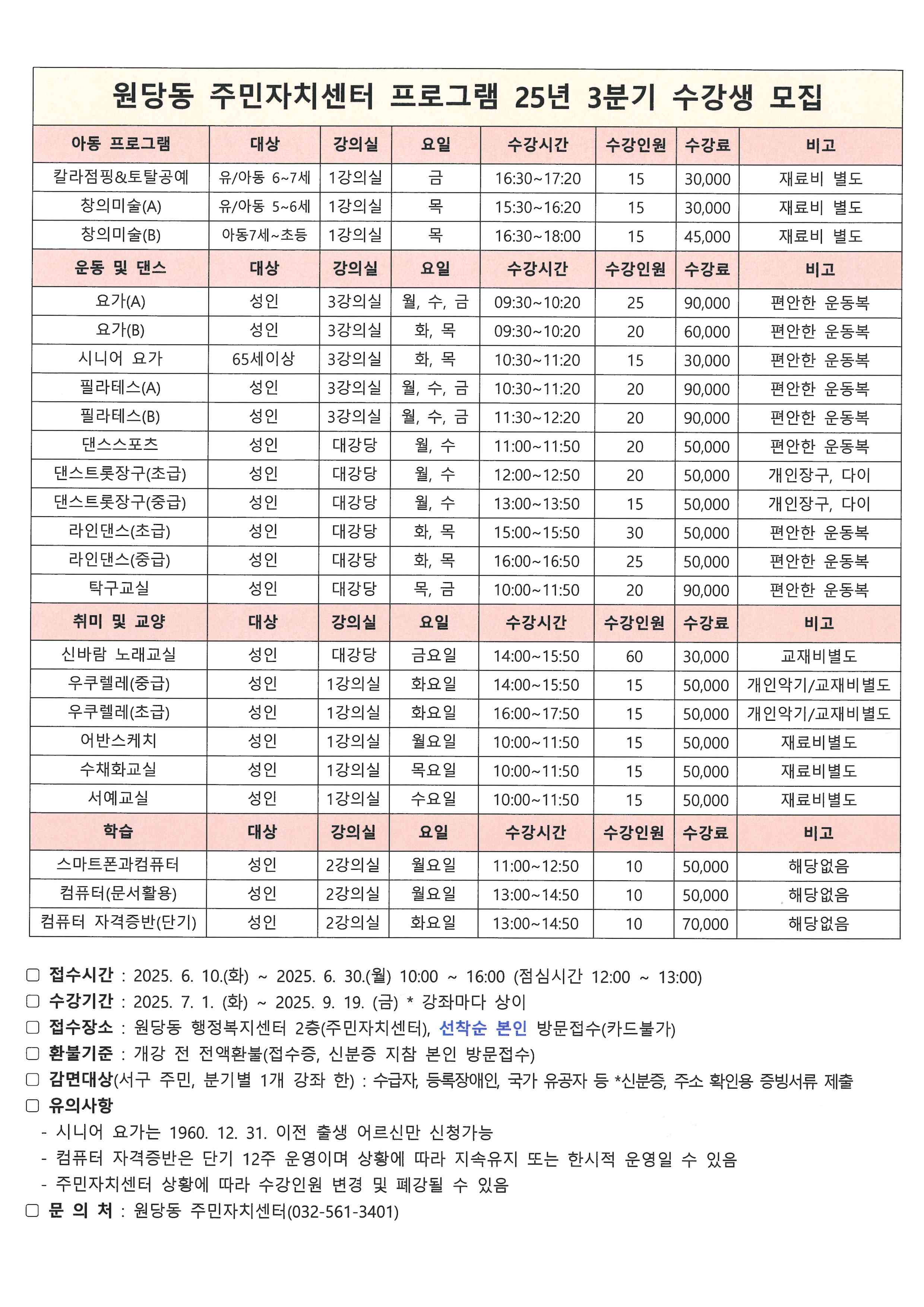 원당동 주민자치센터 문화프로그램 2025년 3분기 수강생 모집 안내