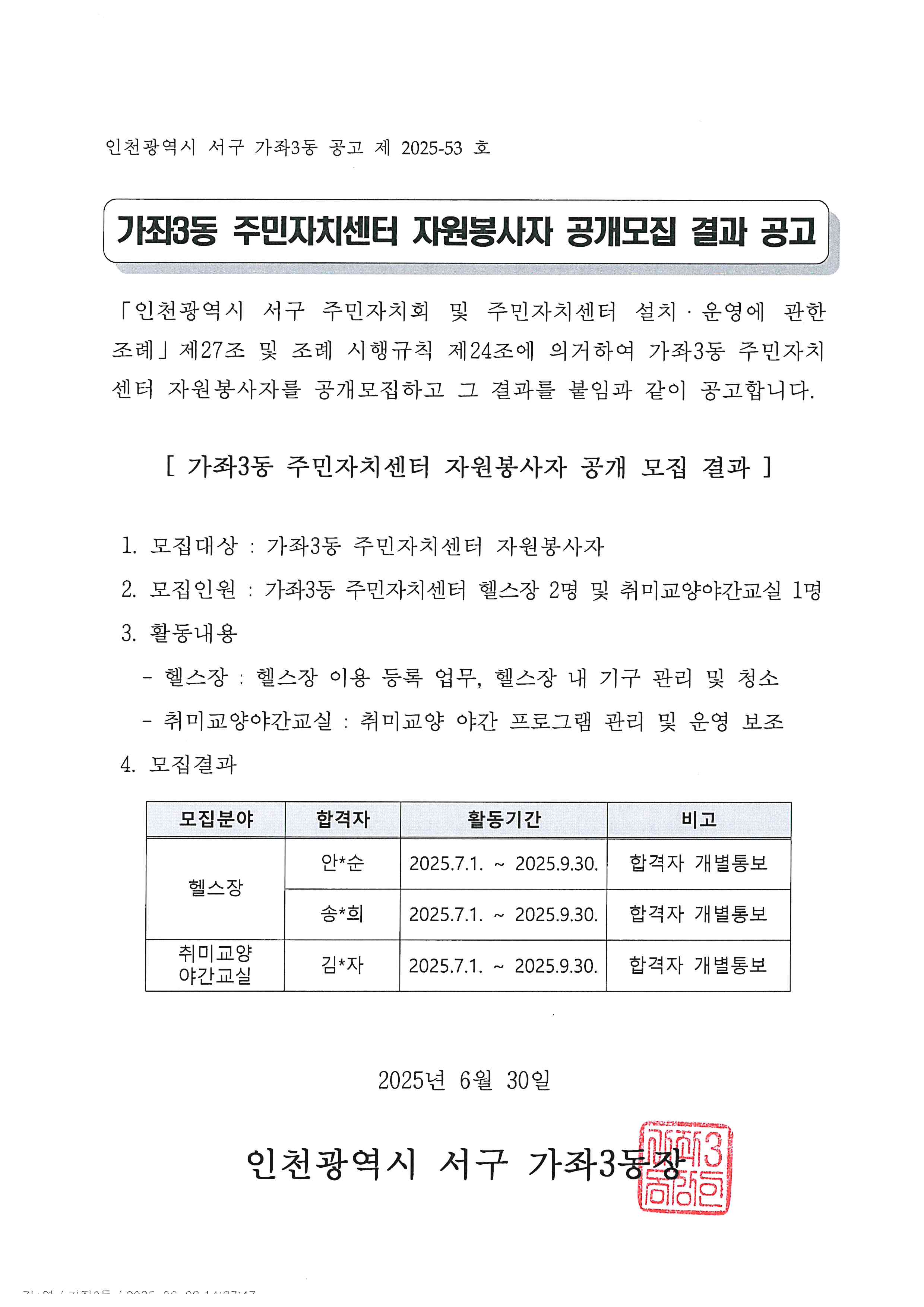 「인천광역시 서구 주민자치회 및 주민자치센터 설치·운영에 관한 조례」제27조 및 조례 시행규칙 제24조에 의거하여 2025년 3분기 주민자치센터 자원봉사자(헬스장 및 취미교양야간교실)를 공개모집하고 그 결과를 붙임과 같이 공고합니다.