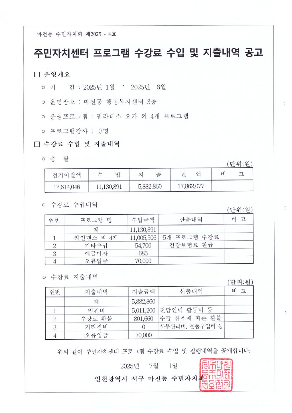 붙임 2025년 상반기 주민자치센터 프로그램 수강료 수입 및 지출내역 공고 1부. 끝.
