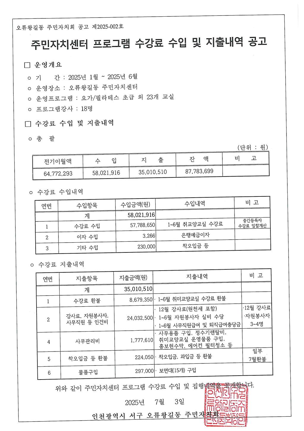 2025년 상반기 오류왕길동 주민자치센터 프로그램 수강료 수입 및 지출 내역을 붙임과 같이 공고합니다.