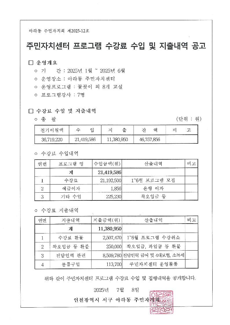 2025년 상반기 아라동 주민자치센터 프로그램 수강료 수입 및 지출 내역을 붙임과 같이 공고합니다.