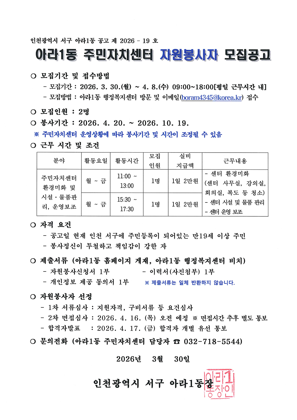 「인천광역시 서구 주민자치회 및 주민자치센터 설치 및 운영에 관한 조례」제27조 및 같은 조례 시행규칙 제24조에 따라 아라1동 주민자치센터 자원봉사자 모집에 관하여 붙임과 같이 공고합니다.