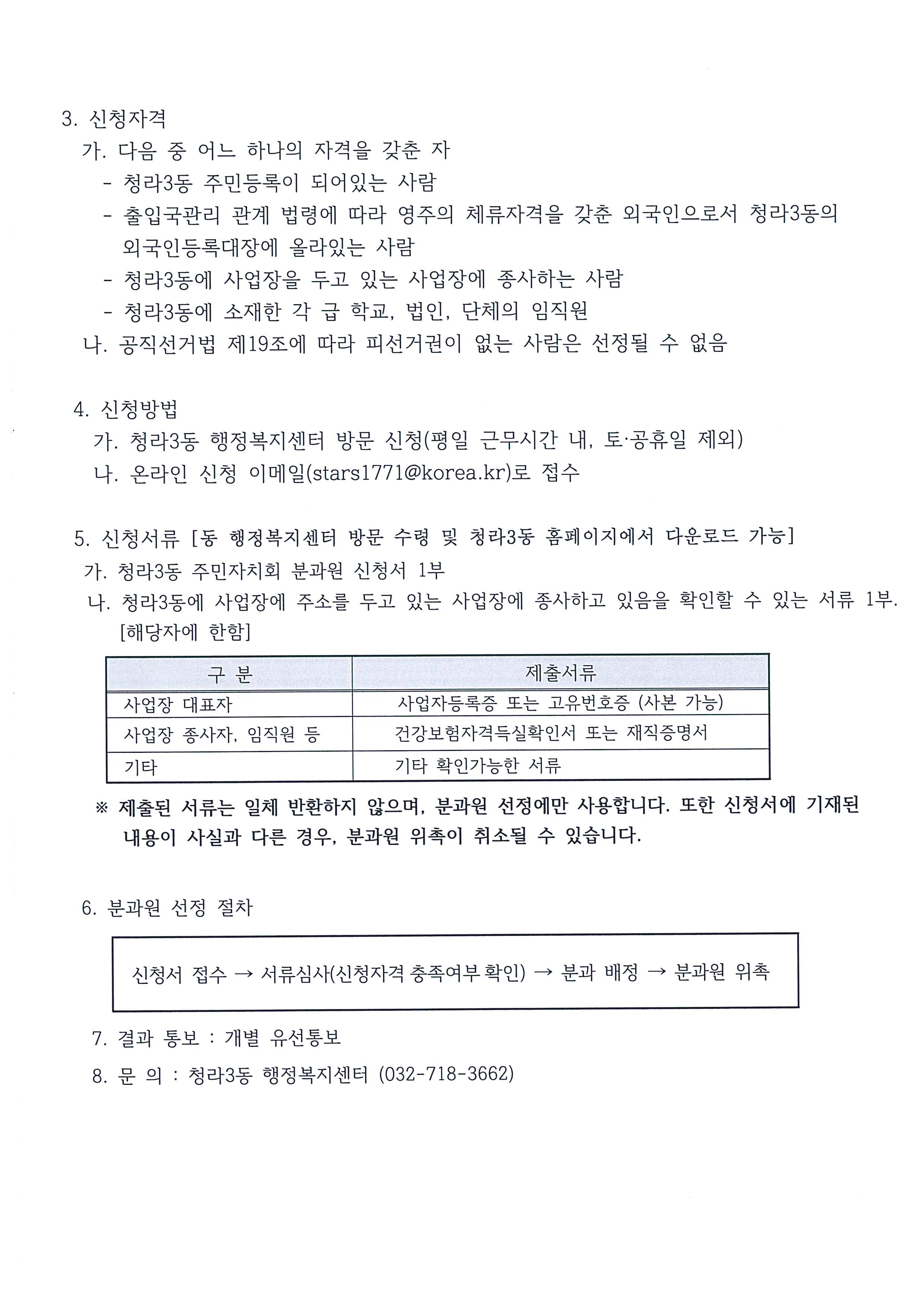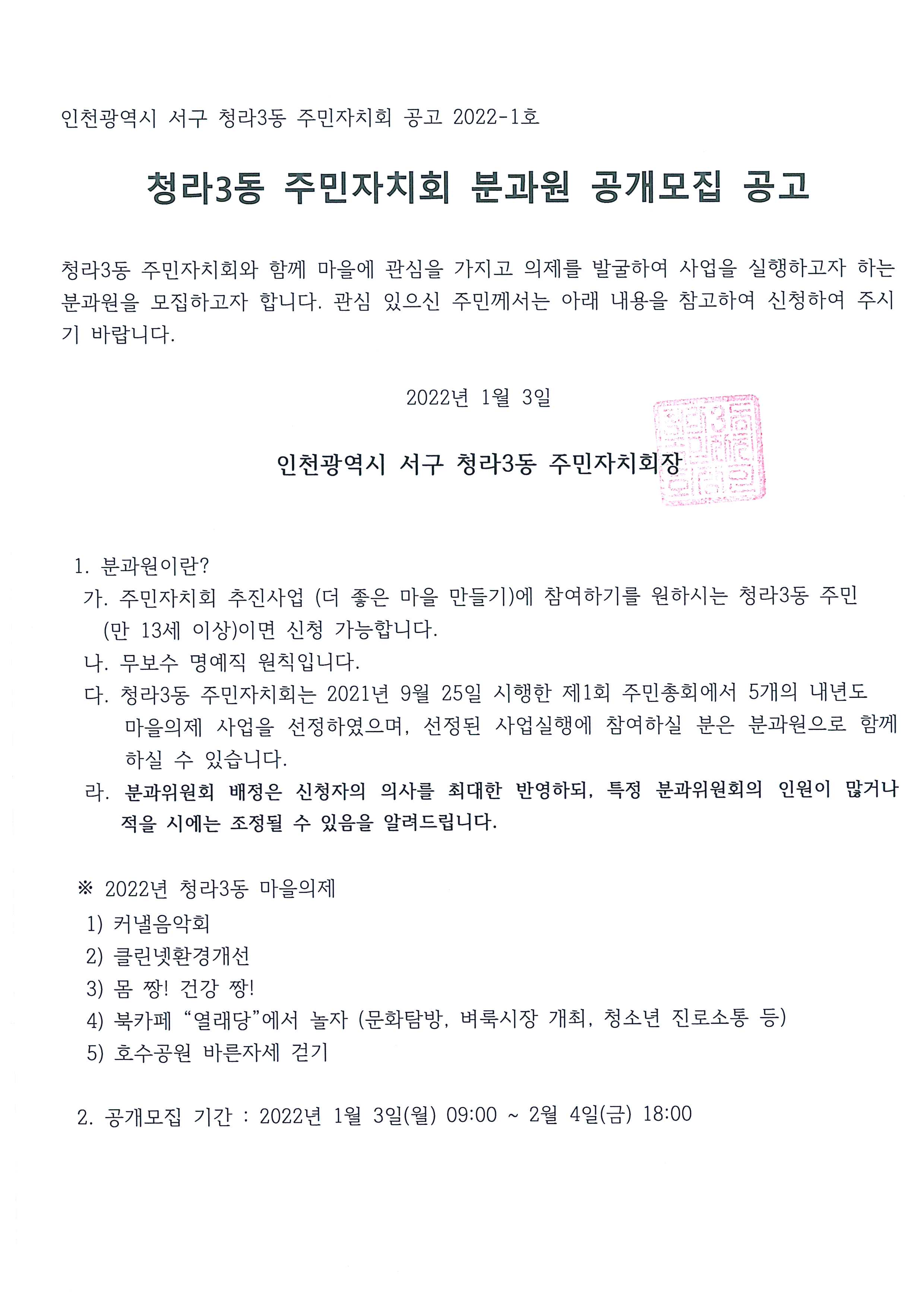 청라3동 주민자치회 분과원을 공개모집을 하오니 참여를 희망하는 주민께서는