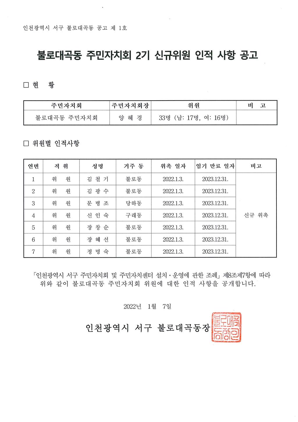 불로대곡동 주민자치회 2기 신규위원 인적사항 공고