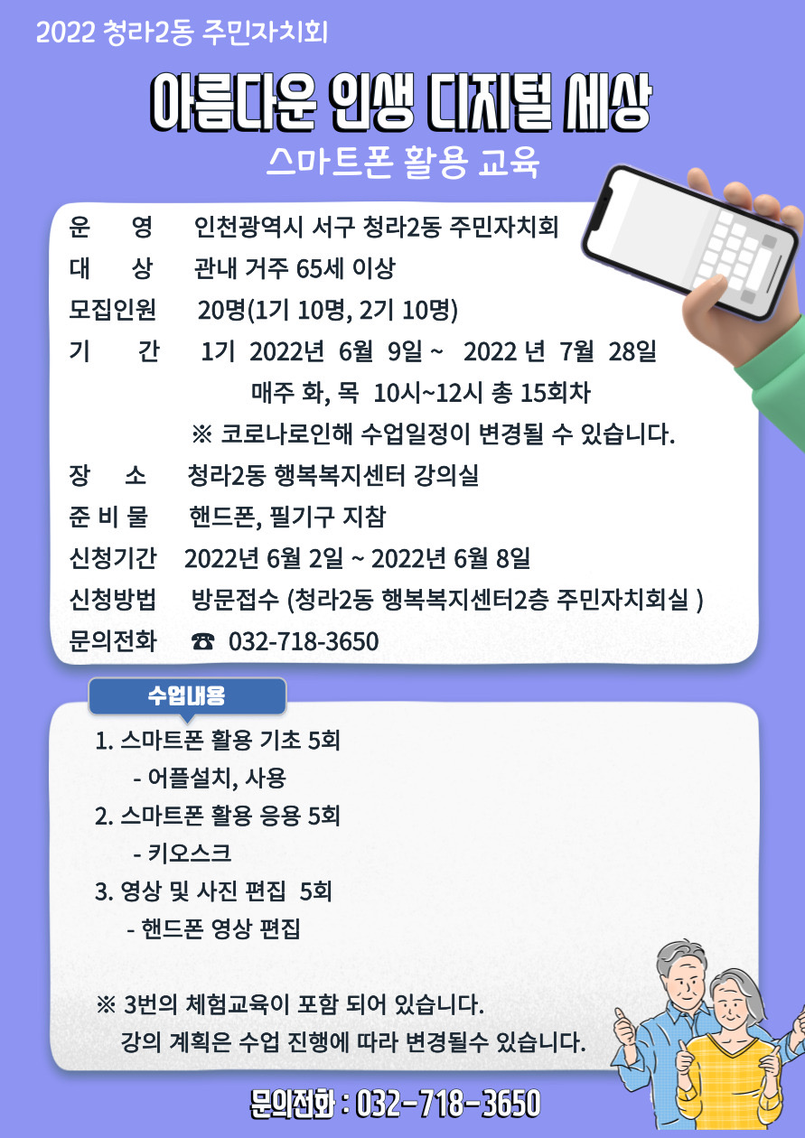 청라2동 주민자치회 두드림분과의 '아름다운 인생 디지털 세상' 사업과 관련하여 스마트폰 활용 교육
