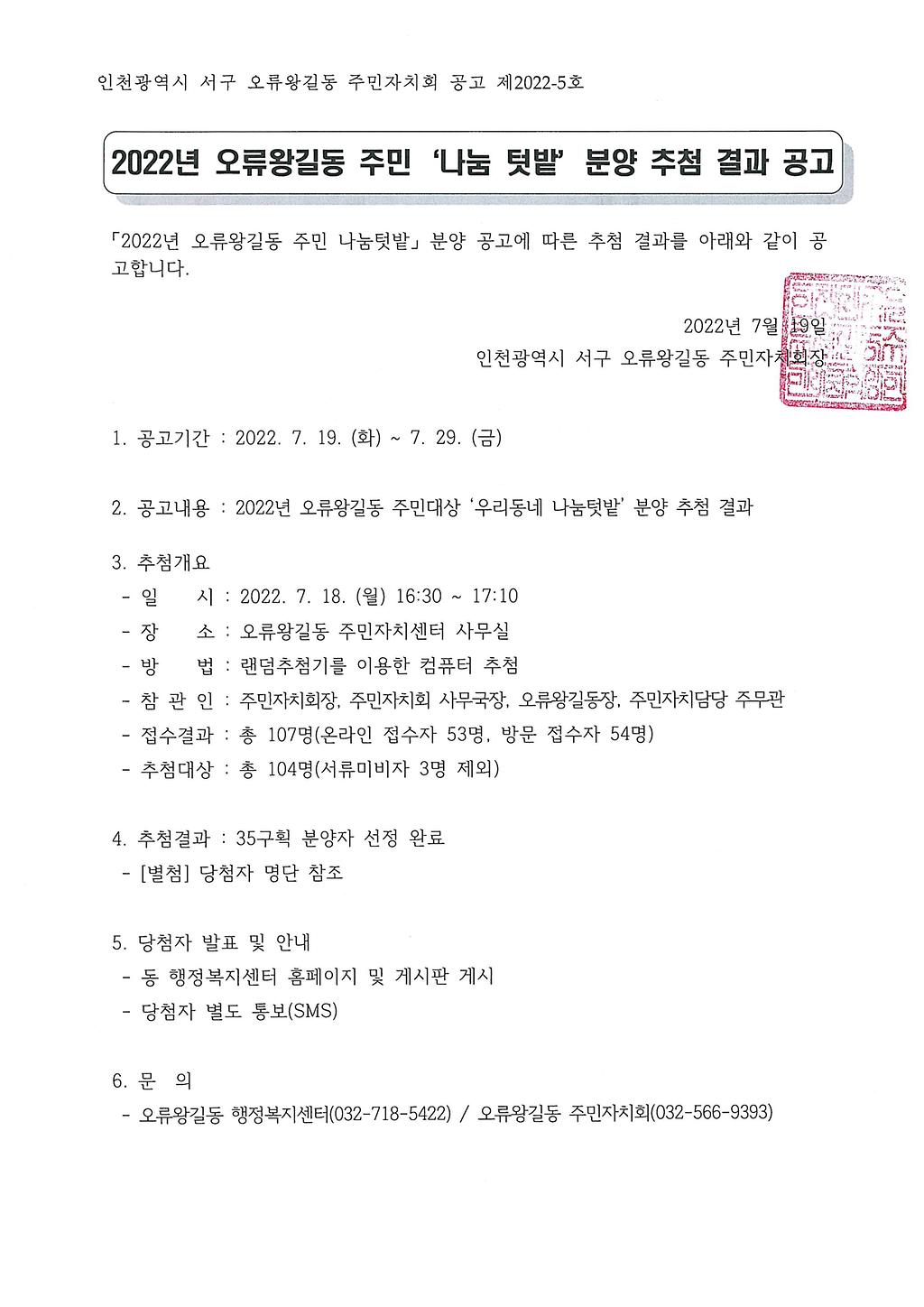 2022년 오류왕길동 주민대상 '우리동네 나눔텃밭' 분양 공고에 따른 추첨 결과를 아래와 같이 공고합니다.