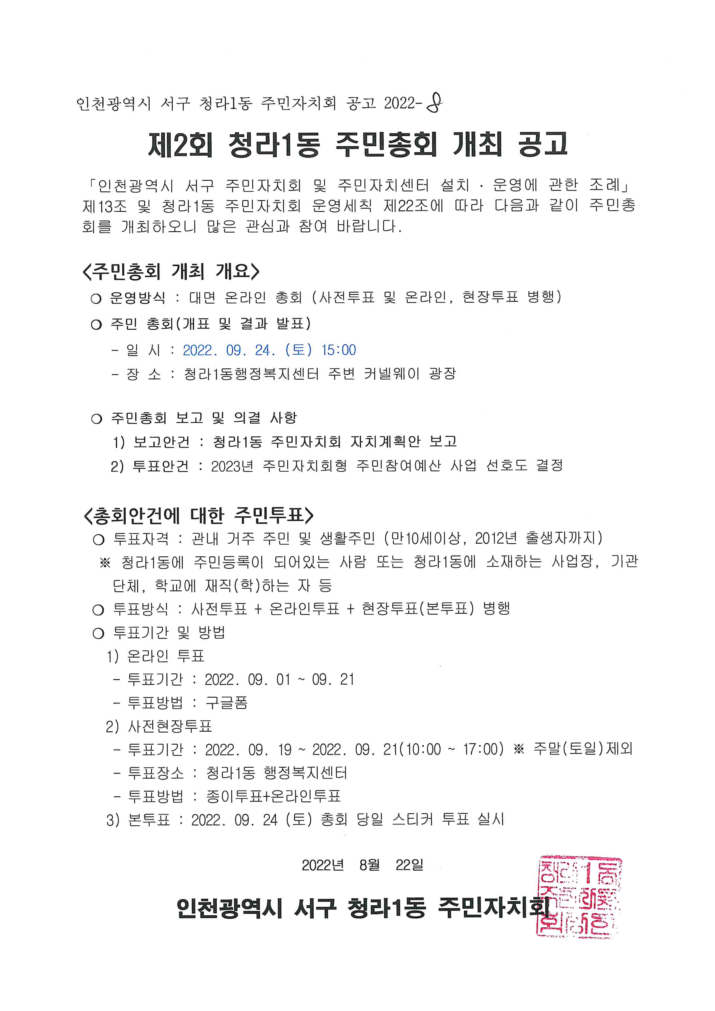 2022년 제2회 청라1동 주민총회 개최 공고