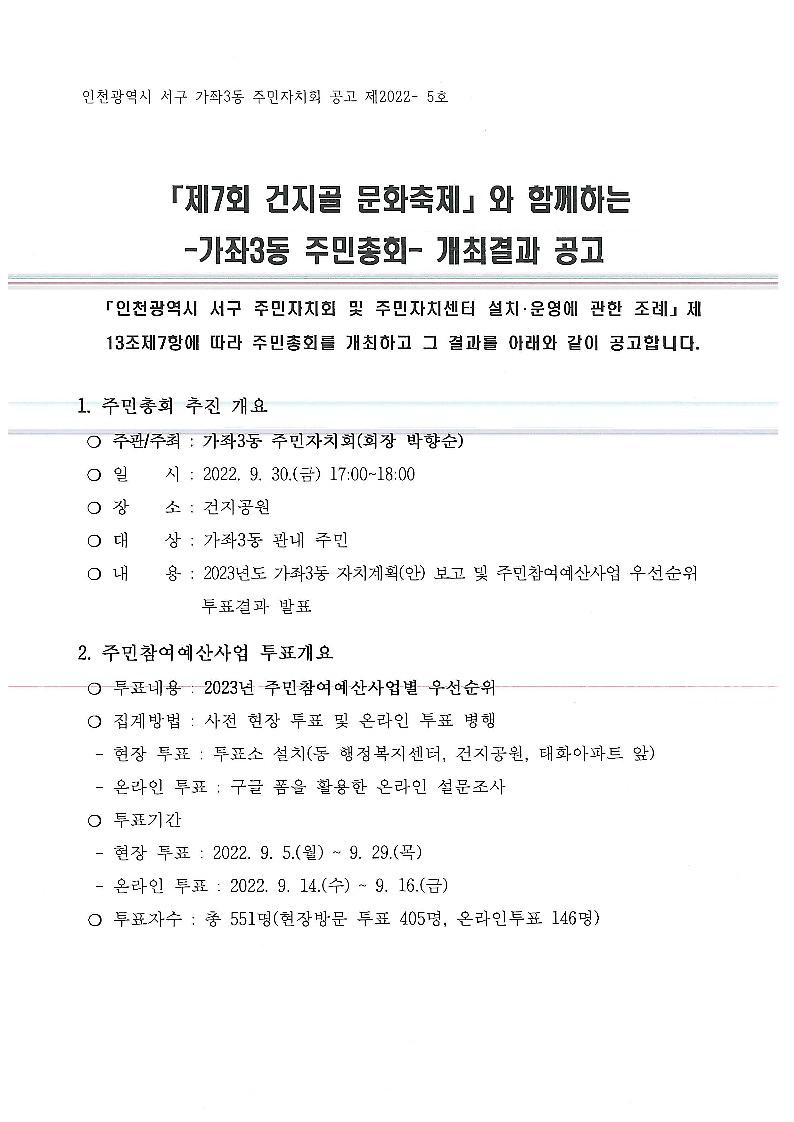 「제7회 건지골 문화축제」와 함께하는 2022년 가좌3동 주민총회 개최 결과 공고