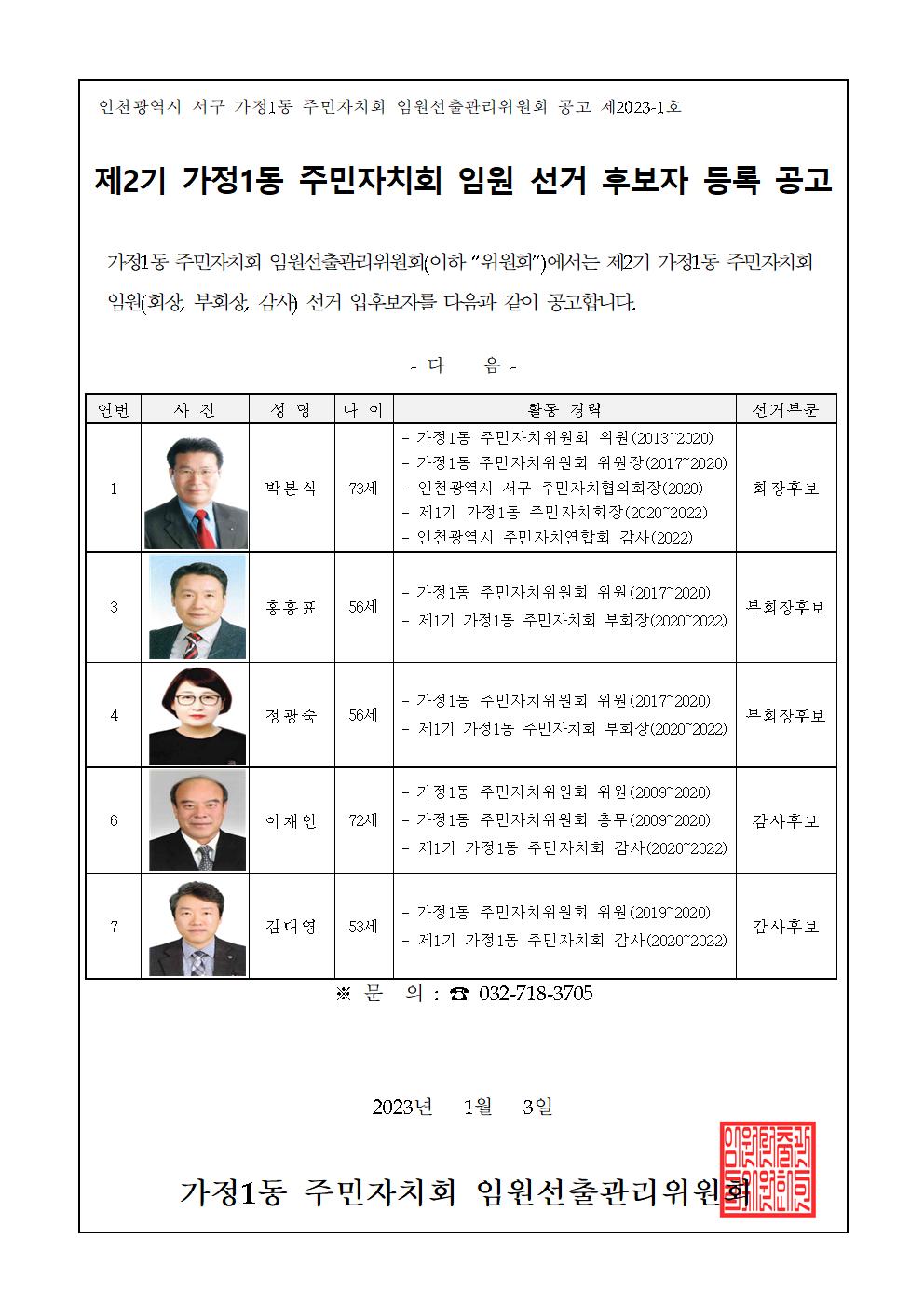 제2기 가정1동 주민자치회 임원선거 후보자 등록 공고