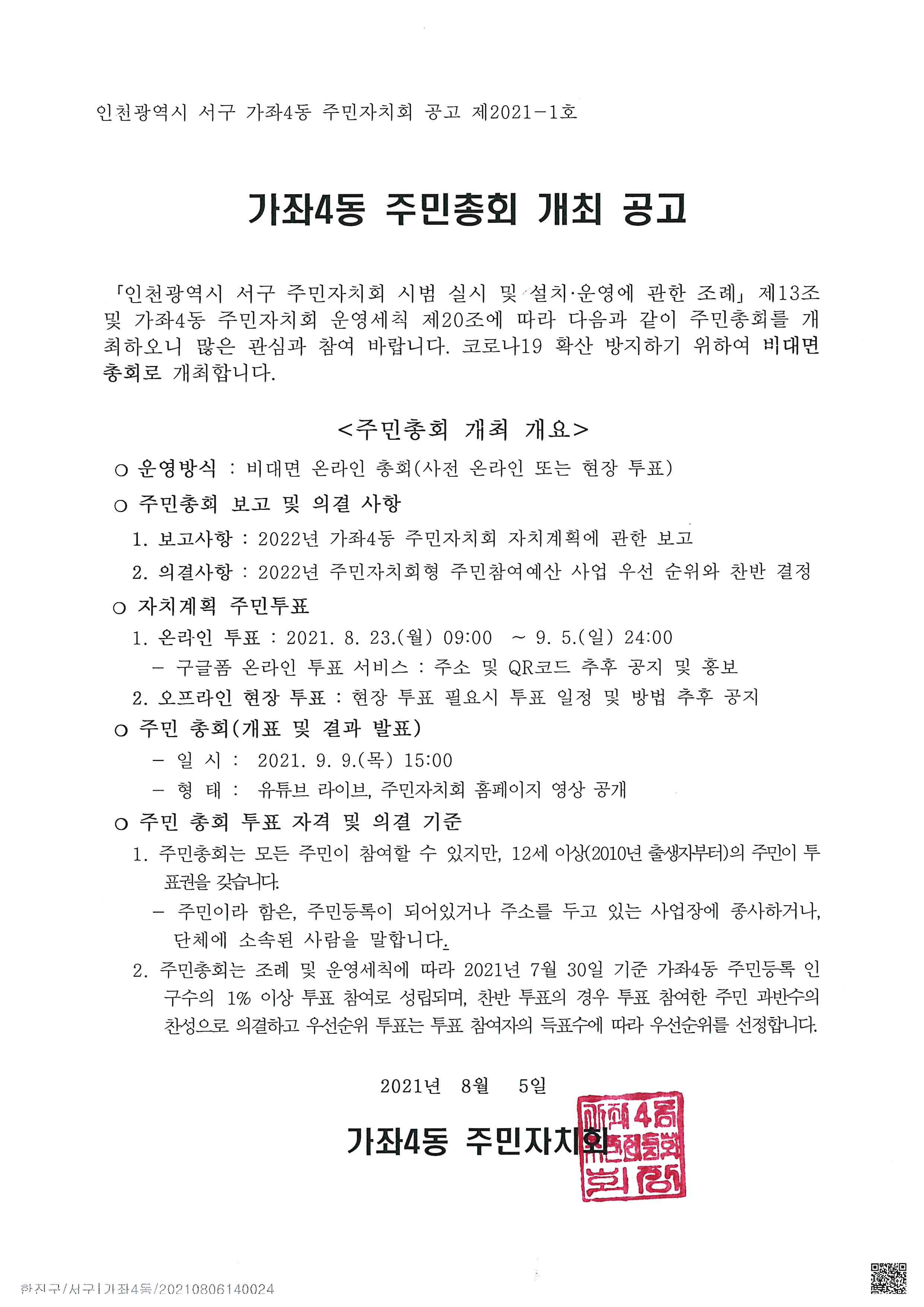 2022년 가좌4동 주민자치회 자치계획안 게시